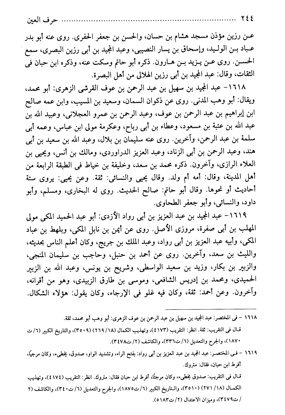 1619 - فى المختصر: عبد المجيد بن عبد العزيز بن أبى رواد: بفتح الراء، وتشديد الواو، صدوق، يخطىء، وكان مرجيًا، أفرط ابن حبان، فقال: متروك.
