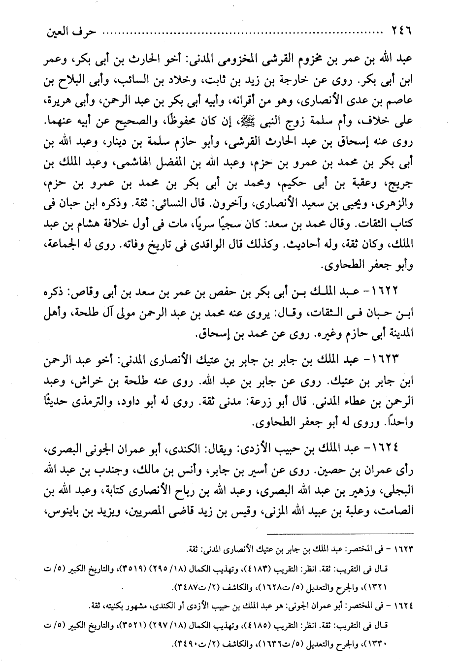 1624 - عبد الملك بن حبيب الأزدى: ويقال: الكندى، أبو عمران الجونى البصرى، رأى عمران بن حصين. روى عن أسير بن جابر، وأنس بن مالك، وجندب بن عبد الله البجلى، وزهير بن عبد الله البصرى، وعبد الله بن رباح الأنصارى كتابة، وعبد الله بن الصامت، وعلبة بن عبيد الله المزنى، وقيس بن زيد قاضى المصريين، ويزيد بن باينوس،