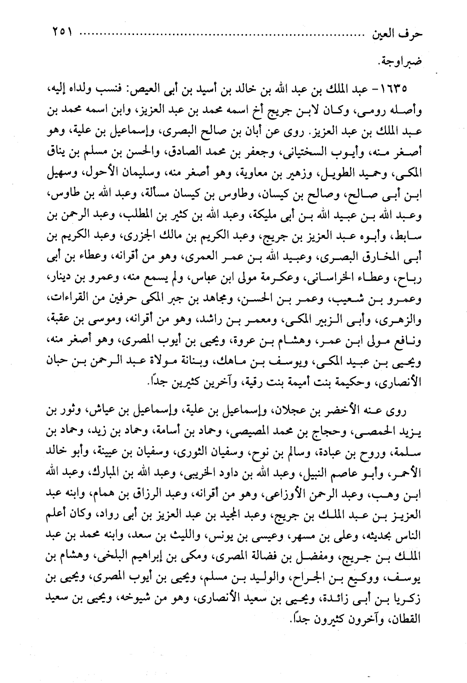 1635 - عبد الملك بن عبد الله بن خالد بن أسيد بن أبى العيص: فنسب ولداه إليه، وأصله رومى، وكان لابن جريج أخ اسمه محمد بن عبد العزيز، وابن اسمه محمد بن عبد الملك بن عبد العزيز. روى عن أبان بن صالح البصرى، وإسماعيل بن علية، وهو أصغر منه، وأيوب السختيانى، وجعفر بن محمد الصادق، والحسن بن مسلم بن يناق المكى، وحميد الطويل، وزهير بن معاوية، وهو أصغر منه، وسليمان الأحول، وسهيل ابن أبى صالح، وصالح بن كيسان، وطاووس بن كيسان مسألة، وعبد الله بن طاووس، وعبد الله بن عبيد الله بن أبى مليكة، وعبد الله بن كثير بن المطلب، وعبد الرحمن بن سابط، وأبوه عبد العزيز بن جريج، وعبد الكريم بن مالك الجزرى، وعبد الكريم بن أبى المخارق البصرى، وعبيد الله بن عمر العمرى، وهو من أقرانه، وعطاء بن أبى رباح، وعطاء الخراسانى، وعكرمة مولى ابن عباس، ولم يسمع منه، وعمرو بن دينار، وعمرو بن شعيب، وعمر بن الحسن، ومجاهد بن جبر المكى حرفين من القراءات، والزهرى، وأبى الزبير المكى، ومعمر بن راشد، وهو من أقرانه، وموسى بن عقبة، ونافع مولى ابن عمر، وهشام بن عروة، ويحيى بن أيوب المصرى، وهو أصغر منه، ويحيى بن عبيد المكى، ويوسف بن ماهك، وبنانة مولاة عبد الرحمن بن حبان الأنصارى، وحكيمة بنت أميمة بنت رقية، وآخرين كثيرين جدًا.
