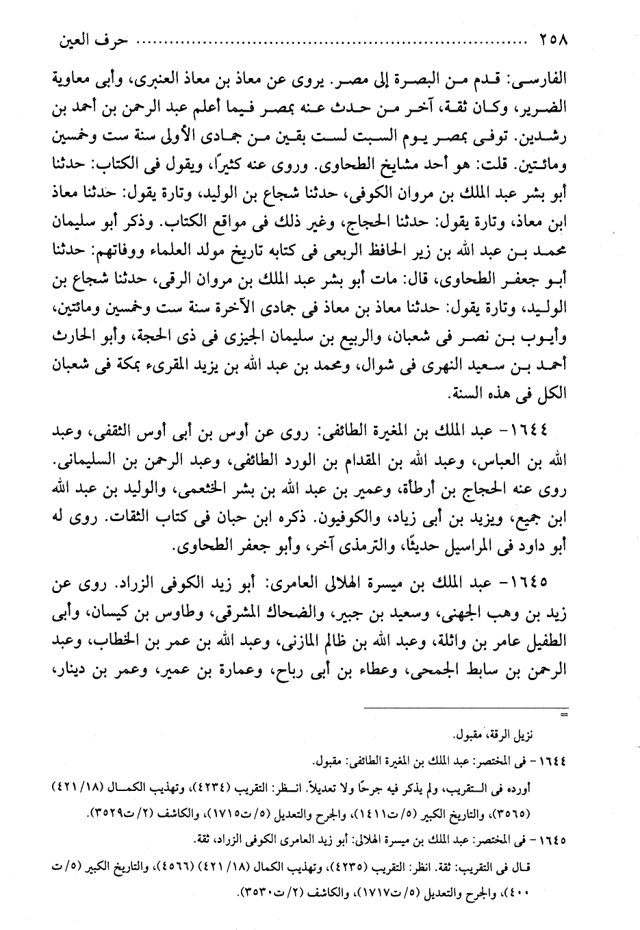 1645 - عبد الملك بن ميسرة الهلالى العامرى: أبو زيد الكوفى الزراد. روى عن زيد بن وهب الجهنى، وسعيد بن جبير، والضحاك المشرقى، وطاووس بن كيسان، وأبى الطفيل عامر بن واثلة، وعبد الله بن ظالم المازنى، وعبد الله بن عمر بن الخطاب، وعبد الرحمن بن سابط الجمحى، وعطاء بن أبى رباح، وعمارة بن عمير، وعمر بن دينار،