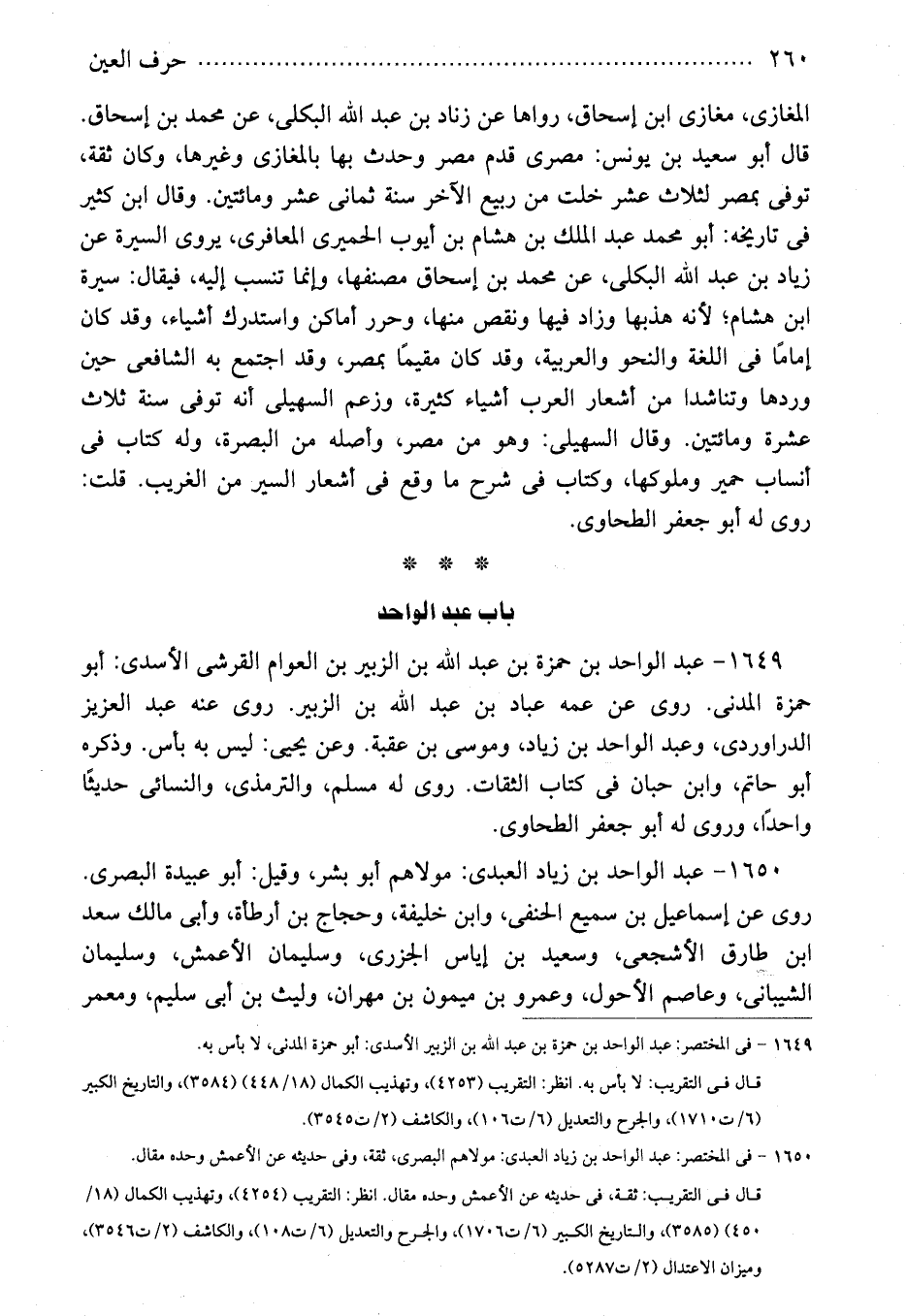 1650 - عبد الواحد بن زياد العبدى: مولاهم أبو بشر، وقيل: أبو عبيدة البصرى. روى عن إسماعيل بن سميع الحنفى، وابن خليفة، وحجاج بن أرطأة، وأبى مالك سعد ابن طارق الأشجعى، وسعيد بن إياس الجزرى، وسليمان الأعمش، وسليمان الشيبانى، وعاصم الأحول، وعمرو بن ميمون بن مهران، وليث بن أبى سليم، ومعمر