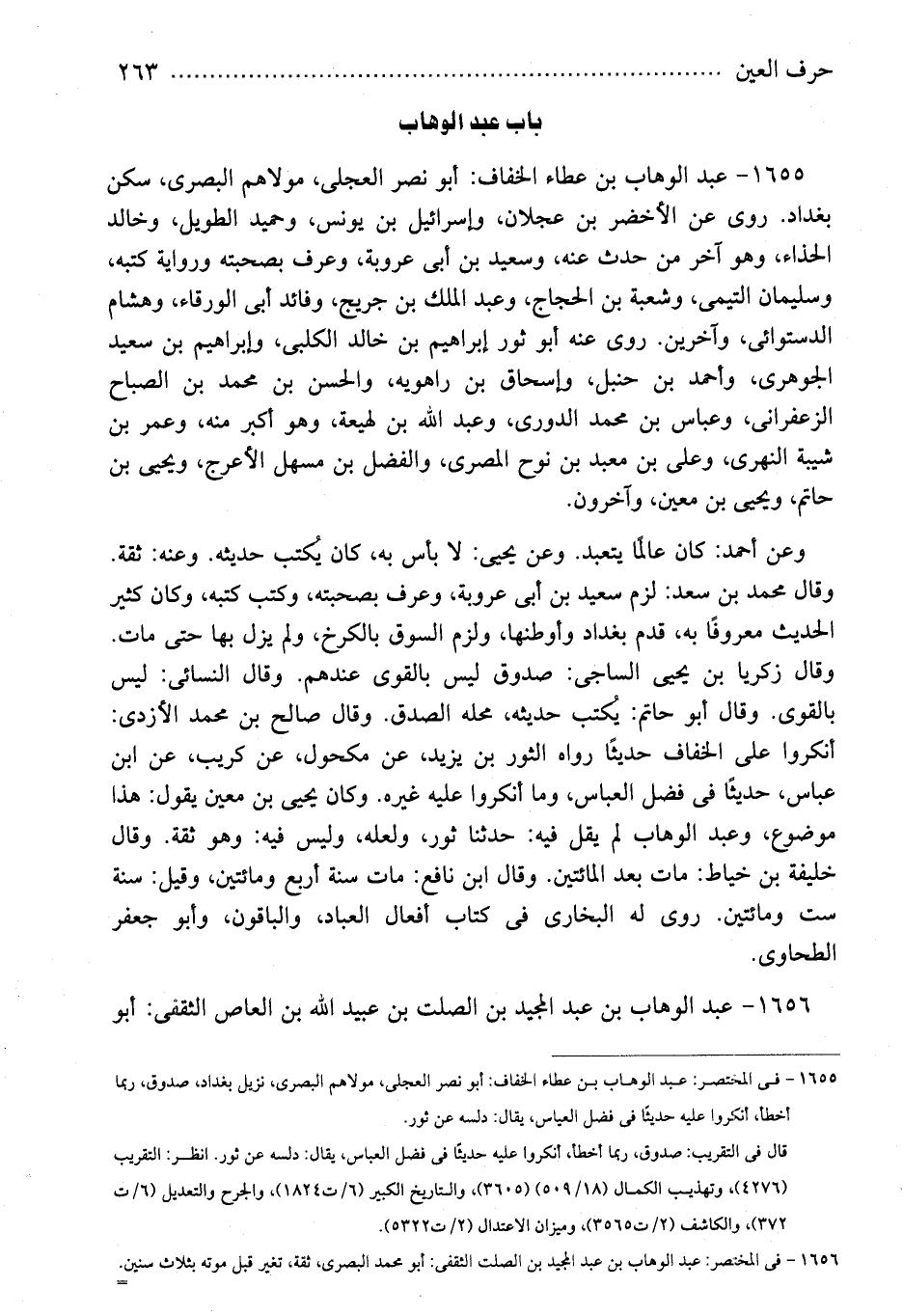1655 - عبد الوهاب بن عطاء الخفاف: أبو نصر العجلى، مولاهم البصرى، سكن بغداد. روى عن الأخضر بن عجلان، وإسرائيل بن يونس، وحميد الطويل، وخالد الحذاء، وهو آخر من حدث عنه، وسعيد بن أبى عروبة، وعرف بصحبته ورواية كتبه، وسليمان التيمى، وشعبة بن الحجاج، وعبد الملك بن جريج، وفائد أبى الورقاء، وهشام الدستوائى، وآخرين. روى عنه أبو ثور إبراهيم بن خالد الكلبى، وإبراهيم بن سعيد الجوهرى، وأحمد بن حنبل، وإسحاق بن راهويه، والحسن بن محمد بن الصباح الزعفرانى، وعباس بن محمد الدورى، وعبد الله بن لهيعة، وهو أكبر منه، وعمر بن شيبة النهرى، وعلى بن معبد بن نوح المصرى، والفضل بن مسهل الأعرج، ويحيى بن حاتم، ويحيى بن معين، وآخرون.