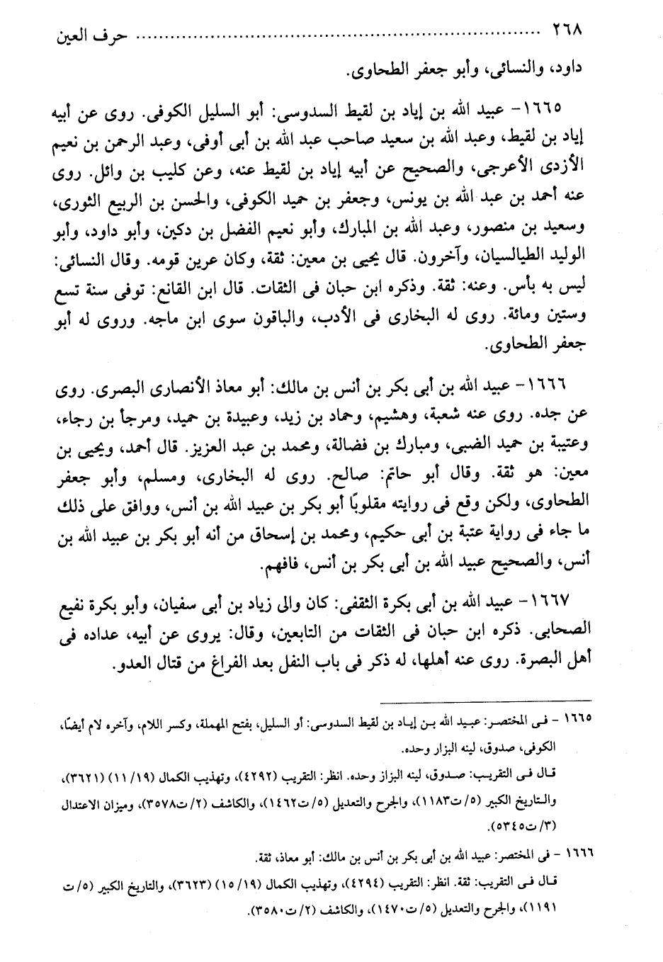 1665 - فى المختصر: عبيد الله بن إياد بن لقيط السدوسى: أو السليل، بفتح المهملة، وكسر اللام، وآخره لام أيضًا، الكوفى، صدوق، لينه البزار وحده.