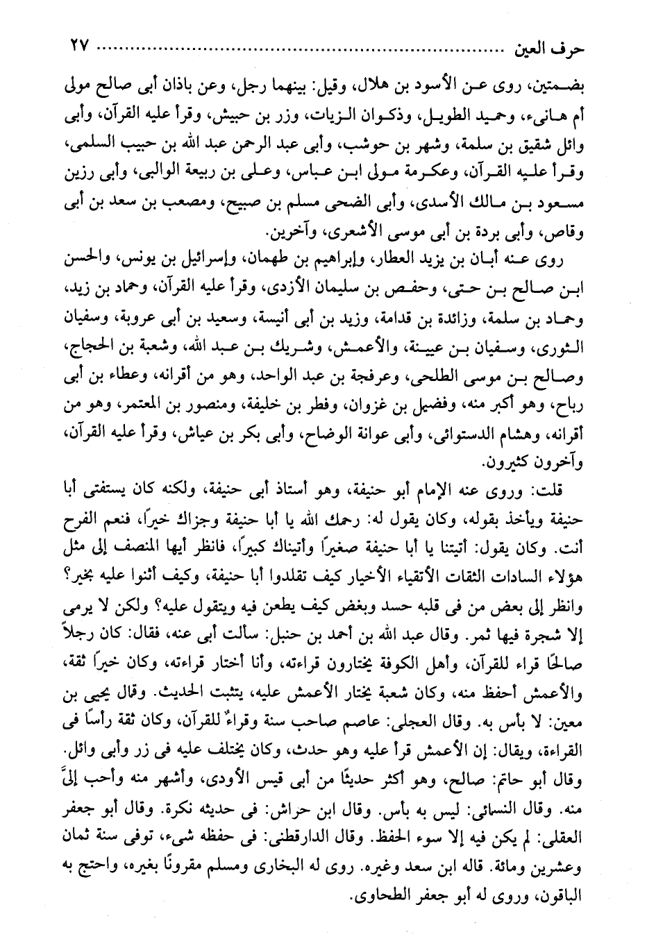 قلت: وروى عنه الإمام أبو حنيفة، وهو أستاذ أبى حنيفة، ولكنه كان يستفتى أبا حنيفة ويأخذ بقوله، وكان يقول له: رحمك الله يا أبا حنيفة وجزاك خيرًا، فنعم الفرح أنت. وكان يقول: أتيتنا يا أبا حنيفة صغيرًا وأتيناك كبيرًا، فانظر أيها المنصف إلى مثل هؤلاء السادات الثقات الأتقياء الأخيار كيف تقلدوا أبا حنيفة، وكيف أثنوا عليه بخير؟ وانظر إلى بعض من فى قلبه حسد وبغض كيف يطعن فيه ويتقول عليه؟ ولكن لا يرمى إلا شجرة فيها ثمر. وقال عبد الله بن أحمد بن حنبل: سألت أبى عنه، فقال: كان رجلاً صالحًا قراء للقرآن، وأهل الكوفة يختارون قراءته، وأنا أختار قراءته، وكان خيرًا ثقة، والأعمش أحفظ منه، وكان شعبة يختار الأعمش عليه، يتثبت الحديث. وقال يحيى بن معين: لا بأس به. وقال العجلى: عاصم صاحب سنة وقراءٌ للقرآن، وكان ثقة رأسًا فى القراءة، ويقال: إن الأعمش قرأ عليه وهو حدث، وكان يختلف عليه فى زر وأبى وائل. وقال أبو حاتم: صالح، وهو أكثر حديثًا من أبى قيس الأودى، وأشهر منه وأحب إلىَّ منه. وقال النسائى: ليس به بأس. وقال ابن حراش: فى حديثه نكرة. وقال أبو جعفر العقلى: لم يكن فيه إلا سوء الحفظ. وقال الدارقطنى: فى حفظه شىء، توفى سنة ثمان وعشرين ومائة. قاله ابن سعد وغيره. روى له البخارى ومسلم مقرونًا بغيره، واحتج به الباقون، وروى له أبو جعفر الطحاوى.
