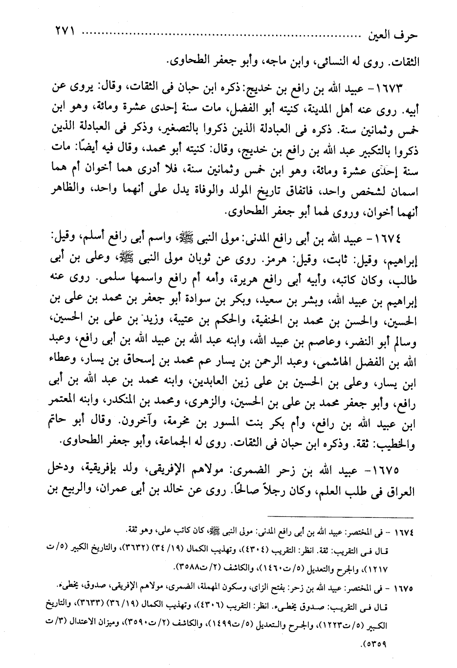 1673 - عبيد الله بن رافع بن خديج: ذكره ابن حبان فى الثقات، وقال: يروى عن أبيه. روى عنه أهل المدينة، كنيته أبو الفضل، مات سنة إحدى عشرة ومائة، وهو ابن خمس وثمانين سنة. ذكره فى العبادلة الذين ذكروا بالتصغير، وذكر فى العبادلة الذين ذكروا بالتكبير عبد الله بن رافع بن خديج، وقال: كنيته أبو محمد، وقال فيه أيضًا: مات سنة إحدى عشرة ومائة، وهو ابن خمس وثمانين سنة، فلا أدرى هما أخوان أم هما اسمان لشخص واحد، فاتفاق تاريخ المولد والوفاة يدل على أنهما واحد، والظاهر أنهما أخوان، وروى لهما أبو جعفر الطحاوى.
