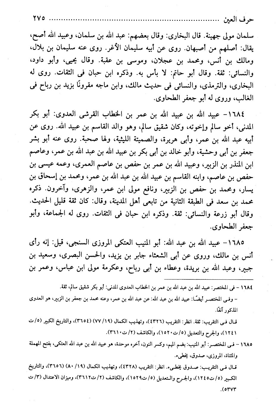 1685 - عبيد الله بن عبد الله: أبو المنيب العتكى المروزى السنجى، قيل: إنه رأى أنس بن مالك، وروى عن أبى الشعثاء جابر بن يزيد، والحسن البصرى، وسعيد بن جبير، وعبد الله بن بريدة، وعطاء بن أبى رباح، وعكرمة مولى ابن عباس، وعمر بن