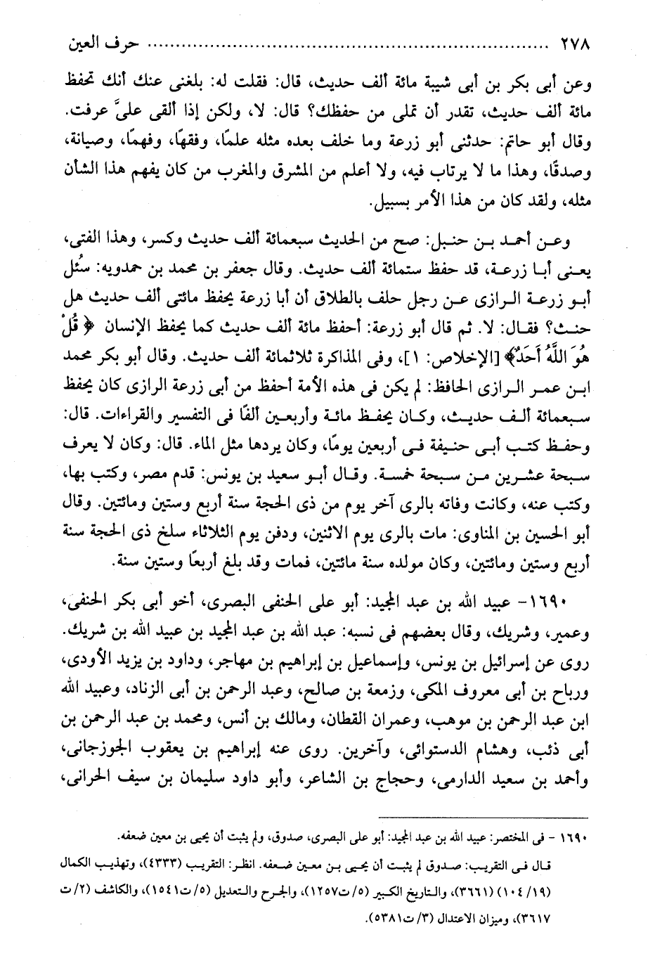 1690 - عبيد الله بن عبد المجيد: أبو على الحنفى البصرى، أخو أبى بكر الحنفى، وعمير، وشريك، وقال بعضهم فى نسبه: عبد الله بن عبد المجيد بن عبيد الله بن شريك. روى عن إسرائيل بن يونس، وإسماعيل بن إبراهيم بن مهاجر، وداود بن يزيد الأودى، ورباح بن أبى معروف المكى، وزمعة بن صالح، وعبد الرحمن بن أبى الزناد، وعبيد الله ابن عبد الرحمن بن موهب، وعمران القطان، ومالك بن أنس، ومحمد بن عبد الرحمن بن أبى ذئب، وهشام الدستوائى، وآخرين. روى عنه إبراهيم بن يعقوب الجوزجانى، وأحمد بن سعيد الدارمى، وحجاج بن الشاعر، وأبو داود سليمان بن سيف الحرانى،
