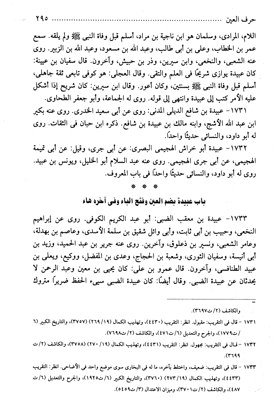 1733 - عبيدة بن معقب الضبى: أبو عبد الكريم الكوفى. روى عن إبراهيم النخعى، وحبيب بن أبى ثابت، وأبى وائل شقيق بن سلمة الأسدى، وعاصم بن بهدلة، وعامر الشعبى، ونسير بن ذعلوق، وآخرين. روى عنه جرير بن عبد الحميد، وزيد بن أبى أنيسة، وسفيان الثورى، وشعبة بن الحجاج، وعدى بن المفضل، ووكيع، ويعلى بن عبيد الطنافسى، وآخرون. قال عمرو بن على: كان يحيى بن معين وعبد الرحمن لا يحدثان عن عبيدة الضبى. وقال أيضًا: كان عبيدة الضبى سيىء الحفظ ضريرًا متروك