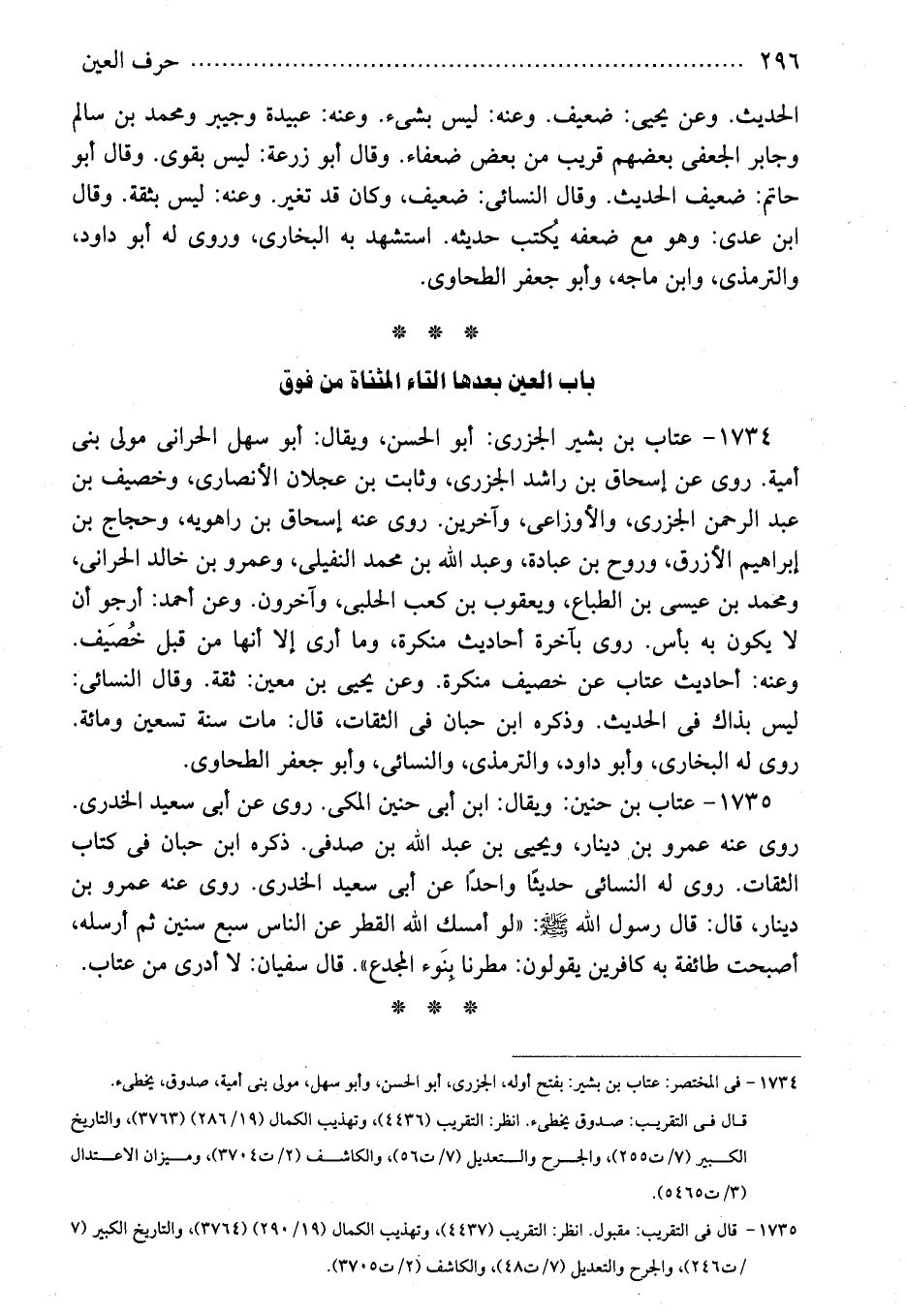 1734 - فى المختصر: عتاب بن بشير: بفتح أوله، الجزرى، أبو الحسن، وأبو سهل، مولى بنى أمية، صدوق، يخطىء.