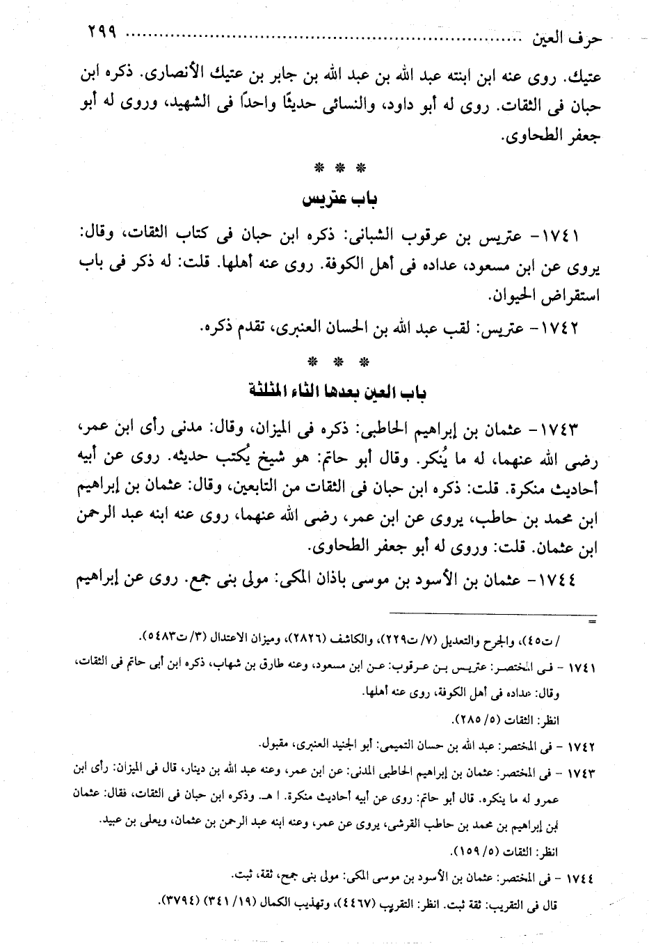 1741 - عتريس بن عرقوب الشبانى: ذكره ابن حبان فى كتاب الثقات، وقال: يروى عن ابن مسعود، عداده فى أهل الكوفة. روى عنه أهلها. قلت: له ذكر فى باب استقراض الحيوان.