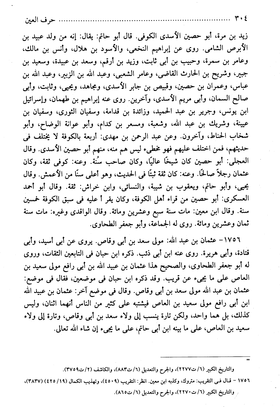 زيد بن مرة، أبو حصين الأسدى الكوفى. قال أبو حاتم: يقال: إنه من ولد عبيد بن الأبرص الشامى. روى عن إبراهيم النخعى، والأسود بن هلال، وأنس بن مالك، وعامر بن سمرة، وحبيب بن أبى ثابت، وزيد بن أرقم، وسعد بن عبيدة، وسعيد بن جبير، وشريح بن الحارث القاضى، وعامر الشعبى، وعبد الله بن الزبير، وعبد الله بن عباس، وعمران بن حصين، وقبيص بن جابر الأسدى، ومجاهد، ويحيى، وثابت، وأبى صالح السمان، وأبى مريم الأسدى، وآخرين. روى عنه إبراهيم بن طهمان، وإسرائيل ابن يونس، وجرير بن عبد الحميد، وزائدة بن قدامة، وسفيان الثورى، وسفيان بن عيينة، وشريك بن عبد الله، وشعبة، ومسعر بن كدام، وأبو عوانة الوضاح، وأبو شخاب الحناط، وآخرون. وعن عبد الرحمن بن مهدى: أربعة بالكوفة لا يختلف فى حديثهم، فمن اختلف عليهم فهو مخطىء ليس هم منه، منهم أبو حصين الأسدى. وقال العجلى: أبو حصين كان شيخًا عاليًا، وكان صاحب سُنة. وعنه: كوفى ثقة، وكان عثمان رجلاً صالحًا. وعنه: كان ثقة ثبتًا فى الحديث، وهو أعلى سنًا من الأعمش. وقال يحيى، وأبو حاتم، ويعقوب بن شيبة، والنسائى، وابن خراش: ثقة. وقال أبو أحمد العسكرى: أبو حصين من قراء أهل الكوفة، وكان يقر أعليه فى سبق الكوفة خمسين سنة. وقال ابن معين: مات سنة سبع وعشرين ومائة. وقال الواقدى وغيره: مات سنة ثمان وعشرين ومائة. روى له الجماعة، وأبو جعفر الطحاوى.