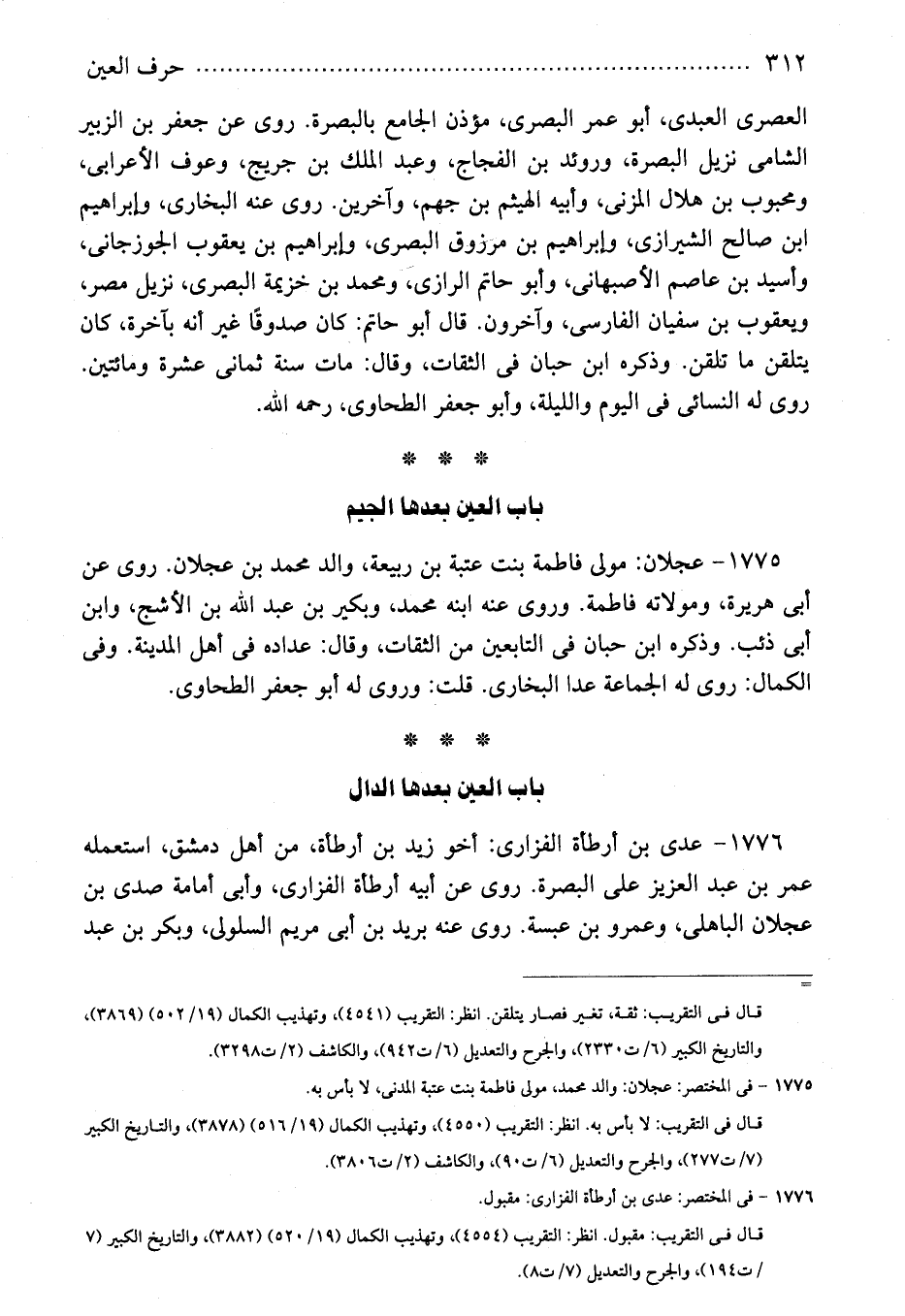 1776 - عدى بن أرطأة الفزارى: أخو زيد بن أرطأة، من أهل دمشق، استعمله عمر بن عبد العزيز على البصرة. روى عن أبيه أرطأة الفزارى، وأبى أمامة صدى بن عجلان الباهلى، وعمرو بن عبسة. روى عنه بريد بن أبى مريم السلولى، وبكر بن عبد