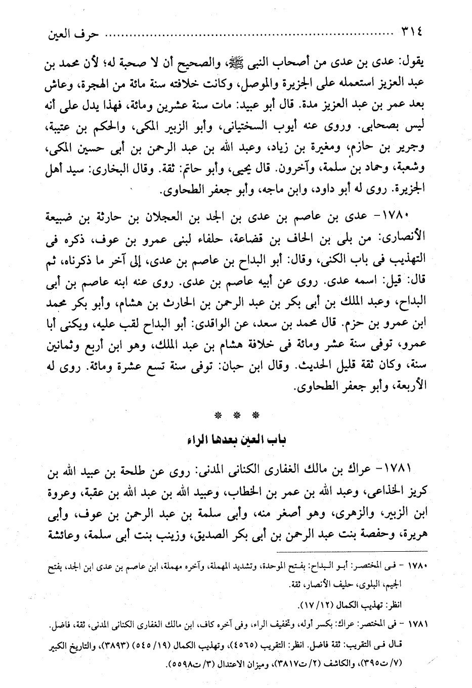1781 - فى المختصر: عراك: بكسر أوله، وتخفيف الراء، وفى آخره كاف، ابن مالك الغفارى الكنانى المدنى، ثقة، فاضل.