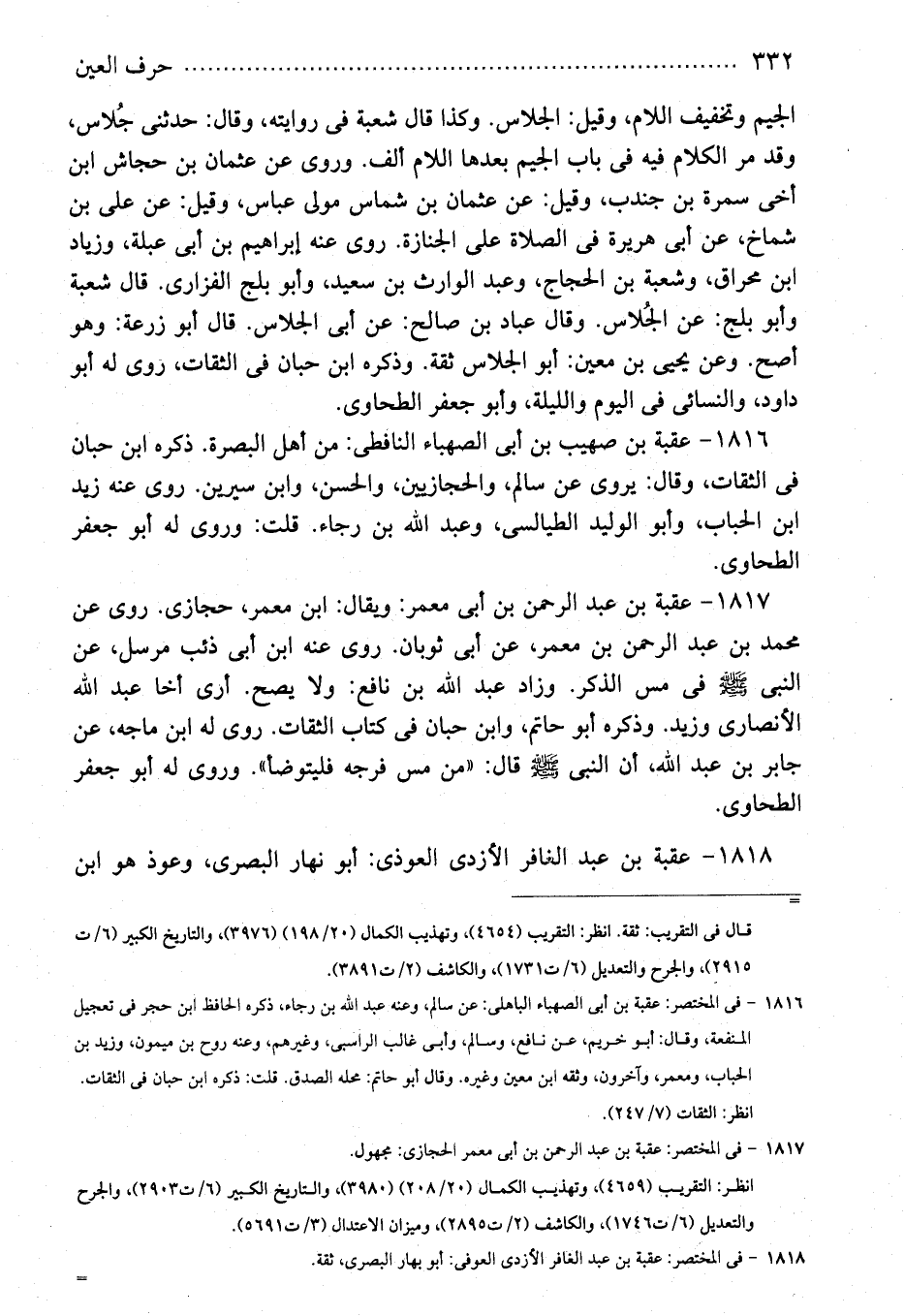 1818 - فى المختصر: عقبة بن عبد الغافر الأزدى العوفى: أبو بهار البصرى، ثقة.
