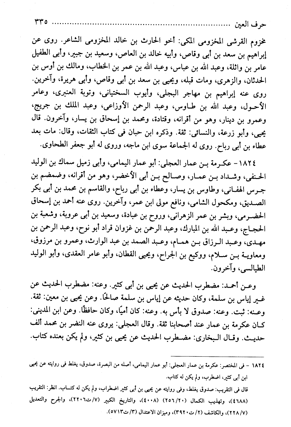1824 - عكرمة بن عمار العجلى: أبو عمار اليمامى، وأبى زميل سماك بن الوليد الحنفى، وشداد بن عمار، وصالح بن أبى الأخضر، وهو من أقرانه، وضمضم بن جرس الهفانى، وطاووس بن يسار، وعطاء بن أبى رباح، والقاسم بن محمد بن أبى بكر الصديق، ومكحول الشامى، ونافع مولى ابن عمر، وآخرين. روى عنه أحمد بن إسحاق الحضرمى، وبشر بن عمر الزهرانى، وروح بن عبادة، وسعيد بن أبى عروبة، وشعبة بن الحجاج، وعبد الله بن المبارك، وعبد الرحمن بن غزوان قراد أبو نوح، وعبد الرحمن بن مهدى، وعبد الرزاق بن همام، وعبد الصمد بن عبد الوارث، وعمرو بن مرزوق، ومعاوية بن سلام، ووكيع بن الجراح، ويحيى القطان، وأبو عامر العقدى، وأبو الوليد الطيالسى، وآخرون.