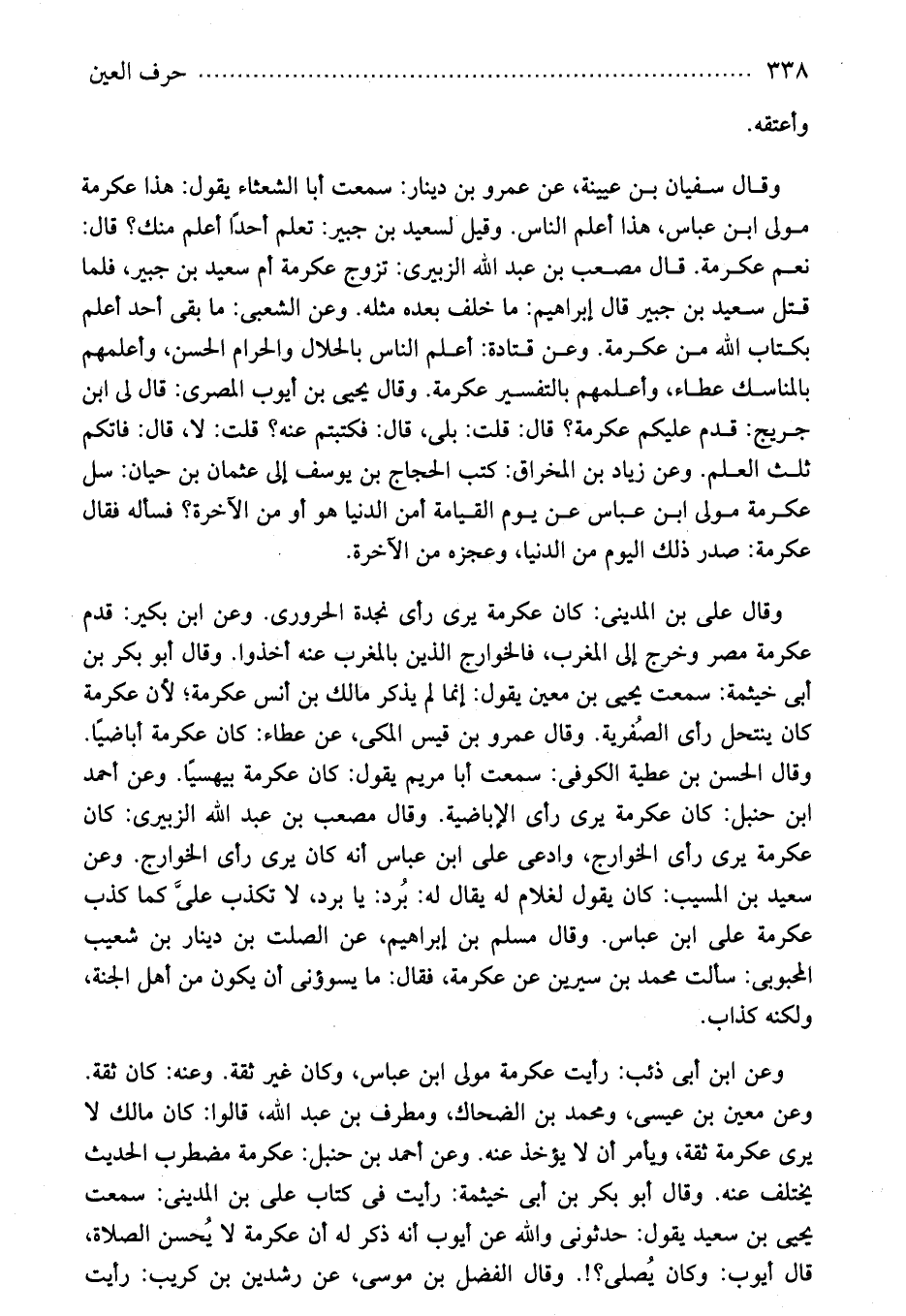 وعن ابن أبى ذئب: رأيت عكرمة مولى ابن عباس، وكان غير ثقة. وعنه: كان ثقة. وعن معين بن عيسى، ومحمد بن الضحاك، ومطرف بن عبد الله، قالوا: كان مالك لا يرى عكرمة ثقة، ويأمر أن لا يؤخذ عنه. وعن أحمد بن حنبل: عكرمة مضطرب الحديث يختلف عنه. وقال أبو بكر بن أبى خيثمة: رأيت فى كتاب على بن المدينى: سمعت يحيى بن سعيد يقول: حدثونى والله عن أيوب أنه ذكر له أن عكرمة لا يُحسن الصلاة، قال أيوب: وكان يُصلى؟!. وقال الفضل بن موسى، عن رشدين بن كريب: رأيت