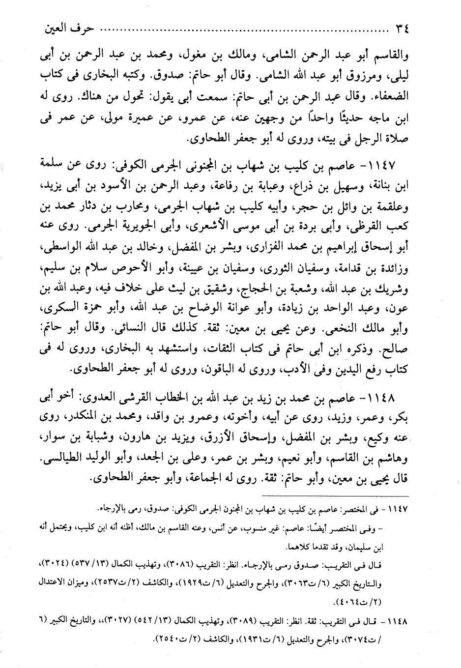 1147 - عاصم بن كليب بن شهاب بن المجنونى الجرمى الكوفى: روى عن سلمة ابن بنانة، وسهيل بن ذراع، وعبابة بن رفاعة، وعبد الرحمن بن الأسود بن أبى يزيد، وعلقمة بن وائل بن حجر، وأبيه كليب بن شهاب الجرمى، ومحارب بن دثار محمد بن كعب القرظى، وأبى بردة بن أبى موسى الأشعرى، وأبى الجويرية الجرمى. روى عنه أبو إسحاق إبراهيم بن محمد الفزارى، وبشر بن المفضل، وخالد بن عبد الله الواسطى، وزائدة بن قدامة، وسفيان الثورى، وسفيان بن عيينة، وأبو الأحوص سلام بن سليم، وشريك بن عبد الله، وشعبة بن الحجاج، وشقيق بن ليث على خلاف فيه، وعبد الله بن عون، وعبد الواحد بن زيادة، وأبو عوانة الوضاح بن عبد الله، وأبو حمزة السكرى، وأبو مالك النخعى. وعن يحيى بن معين: ثقة. كذلك قال النسائى. وقال أبو حاتم: صالح. وذكره ابن أبى حاتم فى كتاب الثقات، واستشهد به البخارى، وروى له فى كتاب رفع اليدين وفى الأدب، وروى له الباقون، وروى له أبو جعفر الطحاوى.