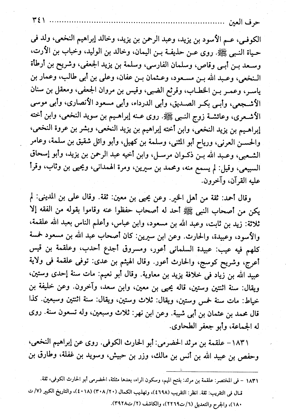 1831 - علقمة بن مرثد الحضرمى: أبو الحارث الكوفى. روى عن إبراهيم النخعى، وحفص بن عبيد الله بن أنس بن مالك، وزر بن حبيش، وسويد بن غفلة، وطارق بن