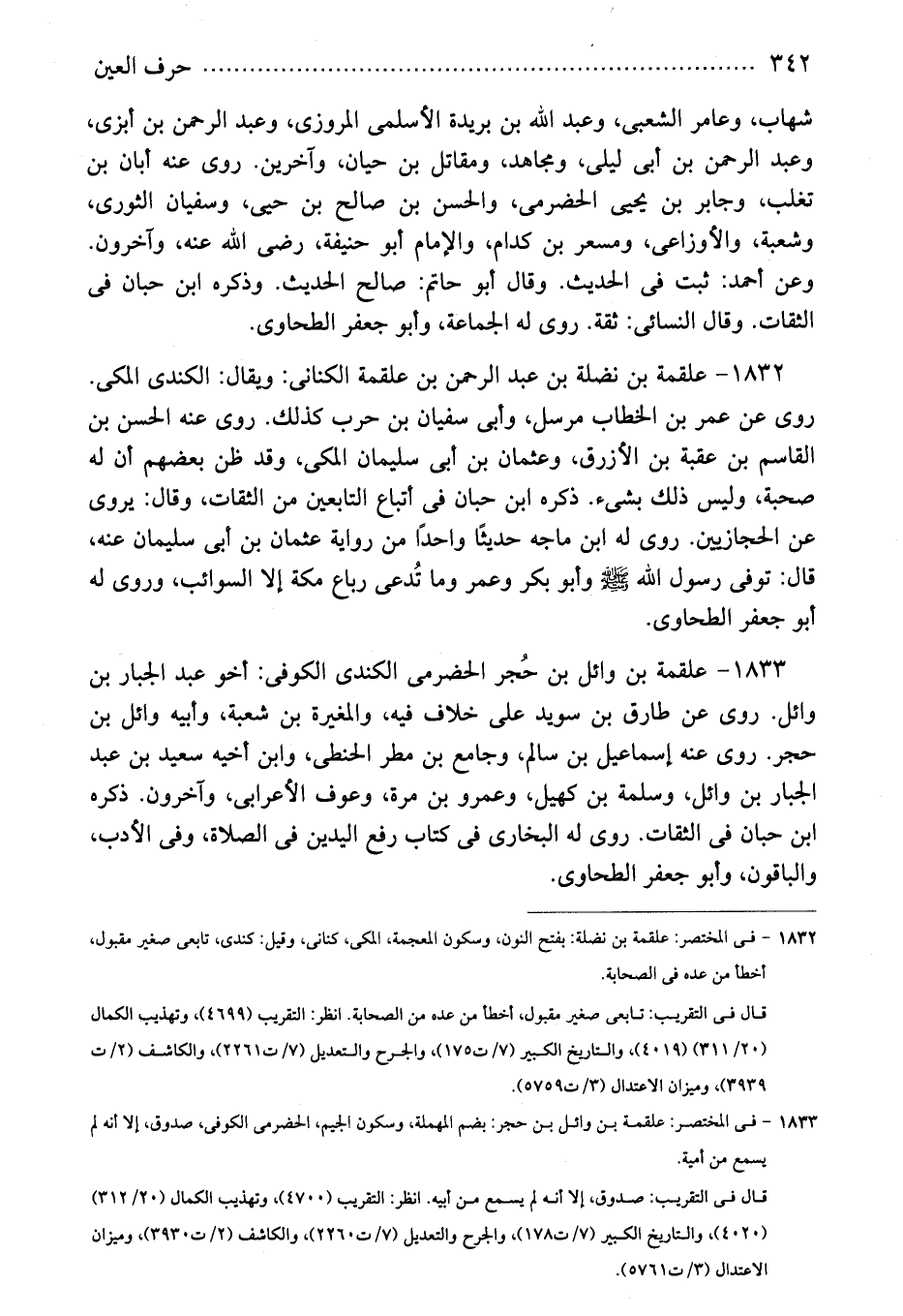1833 - علقمة بن وائل بن حُجر الحضرمى الكندى الكوفى: أخو عبد الجبار بن وائل. روى عن طارق بن سويد على خلاف فيه، والمغيرة بن شعبة، وأبيه وائل بن حجر. روى عنه إسماعيل بن سالم، وجامع بن مطر الحنطى، وابن أخيه سعيد بن عبد الجبار بن وائل، وسلمة بن كهيل، وعمرو بن مرة، وعوف الأعرابى، وآخرون. ذكره ابن حبان فى الثقات. روى له البخارى فى كتاب رفع اليدين فى الصلاة، وفى الأدب، والباقون، وأبو جعفر الطحاوى.