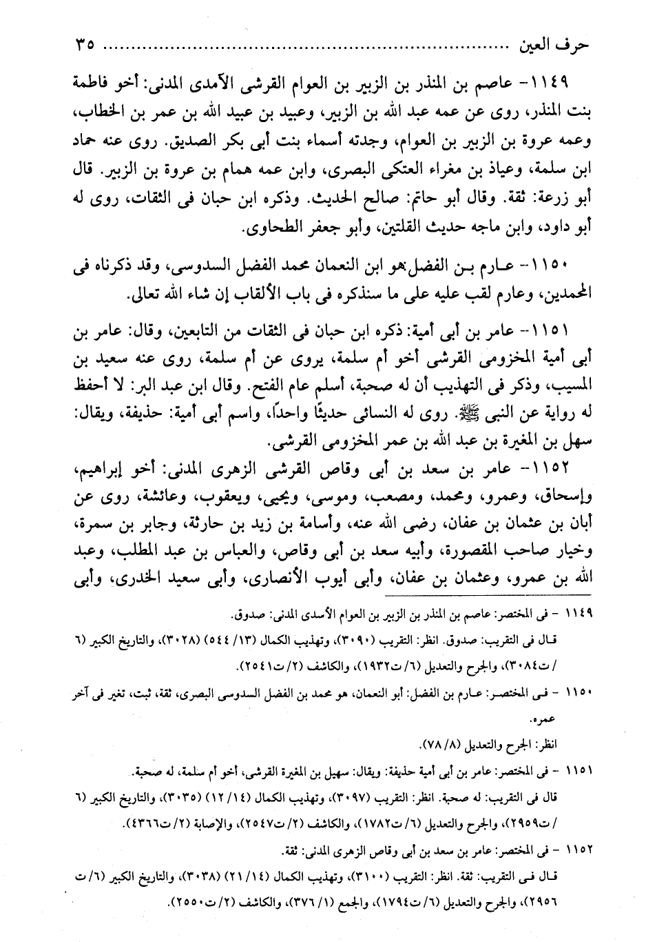 1149 - عاصم بن المنذر بن الزبير بن العوام القرشى الآمدى المدنى: أخو فاطمة بنت المنذر، روى عن عمه عبد الله بن الزبير، وعبيد بن عبيد الله بن عمر بن الخطاب، وعمه عروة بن الزبير بن العوام، وجدته أسماء بنت أبى بكر الصديق. روى عنه حماد ابن سلمة، وعياذ بن مغراء العتكى البصرى، وابن عمه همام بن عروة بن الزبير. قال أبو زرعة: ثقة. وقال أبو حاتم: صالح الحديث. وذكره ابن حبان فى الثقات، روى له أبو داود، وابن ماجه حديث القلتين، وأبو جعفر الطحاوى.