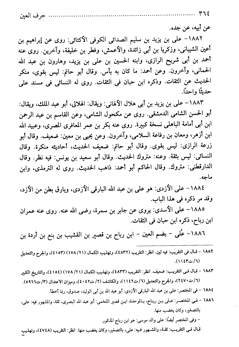 1883 - على بن يزيد بن أبى هلال الألهانى: ويقال: الهلالى، أبو عبد الملك، ويقال: أبو الحسن الشامى الدمشقى. روى عن مكحول الشامى، وعن القاسم بن عبد الرحمن ابن أبى أمامة الباهلى نسخة كبيرة. روى عنه بكر بن عمر المعافرى المصرى، وعبيد الله ابن أزهر، ومعان بن رفاعة السلامى، وآخرون. وعن يحيى بن معين: ضعيف. وقال أبو زرعة الرازى: ليس بقوى. وقال أبو حاتم: ضعيف الحديث، أحاديثه منكرة. وقال النسائى: ليس بثقة. وعنه: متروك الحديث. وقال أبو سعيد بن يونس: فيه نظر. وقال الدارطنى: متروك. وقال الحاكم أبو أحمد: ذاهب الحديث. روى له الترمذى، وابن ماجه.