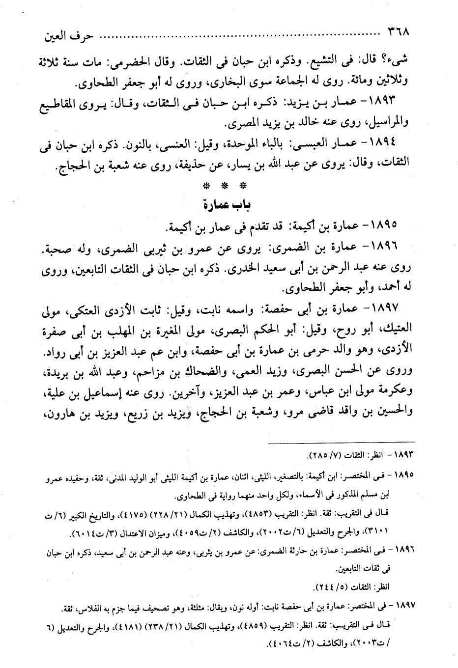 1896 - فى المختصر: عمارة بن حارثة الضمرى: عن عمرو بن يثربى، وعنه عبد الرحمن بن أبى سعيد، ذكره ابن حبان فى ثقات التابعين.