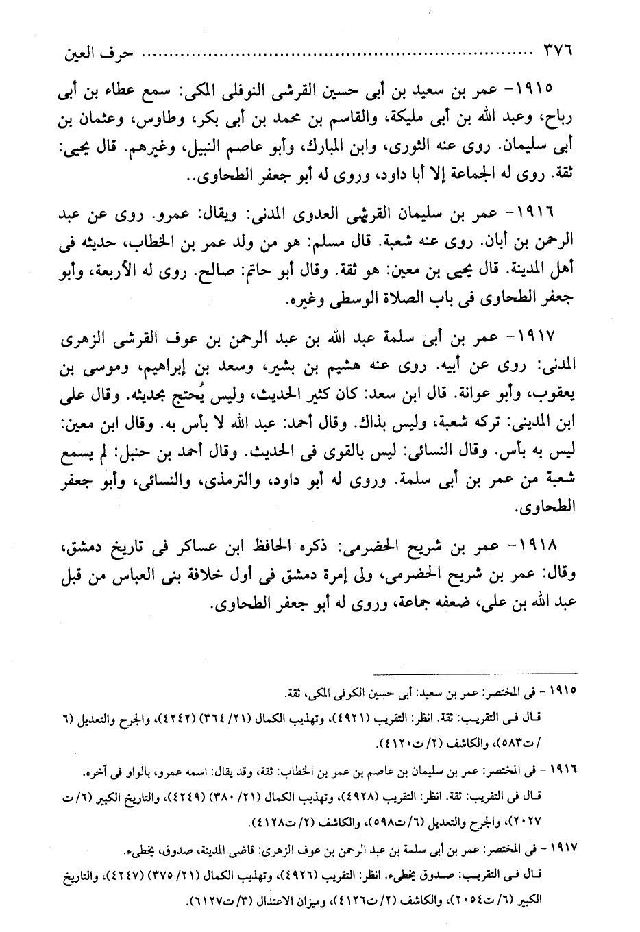 1915 - عمر بن سعيد بن أبى حسين القرشى النوفلى المكى: سمع عطاء بن أبى رباح، وعبد الله بن أبى مليكة، والقاسم بن محمد بن أبى بكر، وطاووس، وعثمان بن أبى سليمان. روى عنه الثورى، وابن المبارك، وأبو عاصم النبيل، وغيرهم. قال يحيى: ثقة. روى له الجماعة إلا أبا داود، وروى له أبو جعفر الطحاوى..