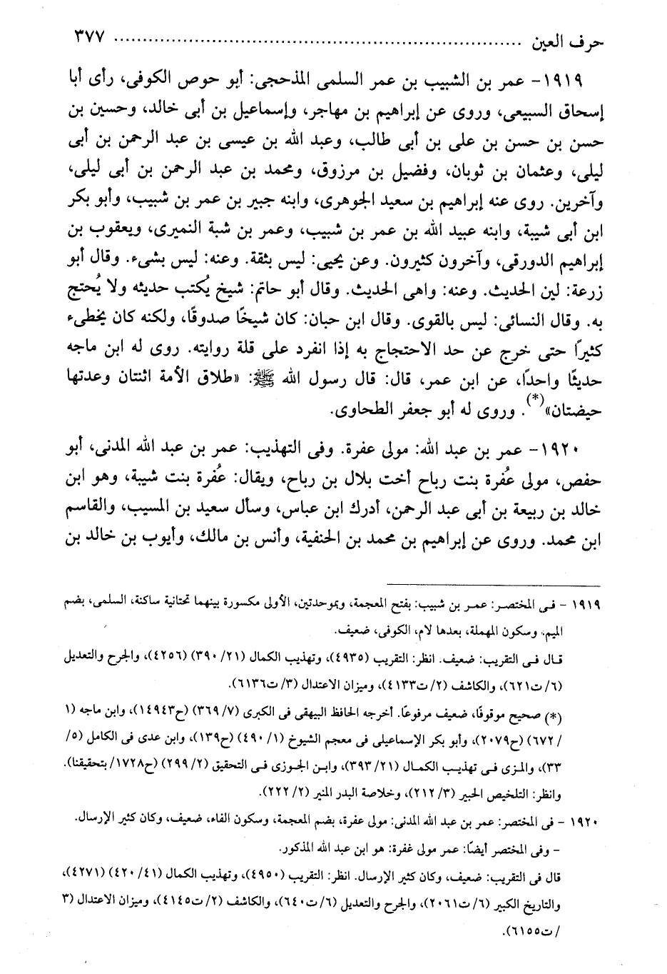 1919 - فى المختصر: عمر بن شبيب: بفتح المعجمة، وبموحدتين، الأولى مكسورة بينهما تحتانية ساكنة، السلمى، بضم الميم، وسكون المهملة، بعدها لام، الكوفى، ضعيف.