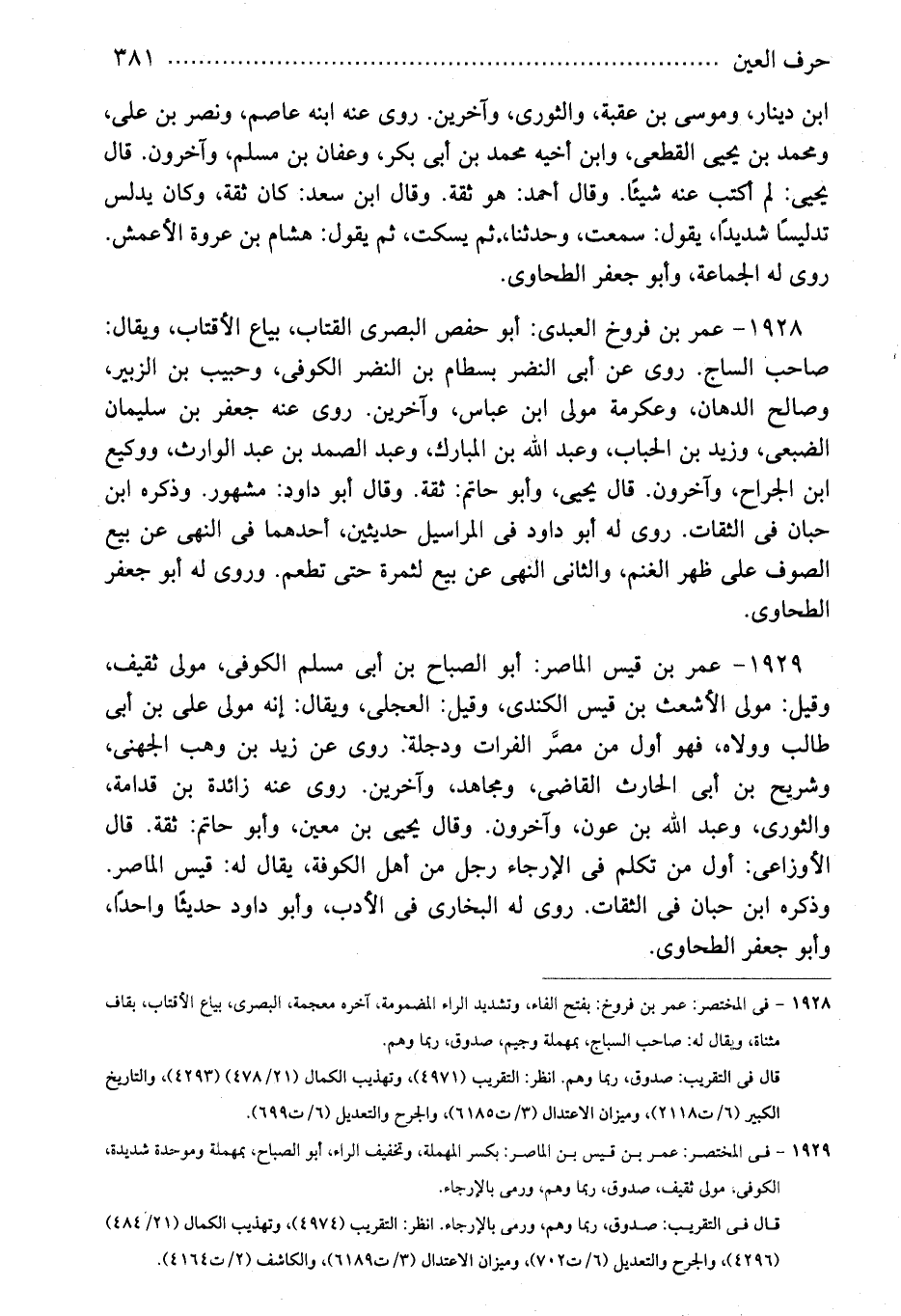 1929 - فى المختصر: عمر بن قيس بن الماصر: بكسر المهملة، وتخفيف الراء، أبو الصباح، بمهملة وموحدة شديدة، الكوفى، مولى ثقيف، صدوق، ربما وهم، ورمى بالإرجاء.