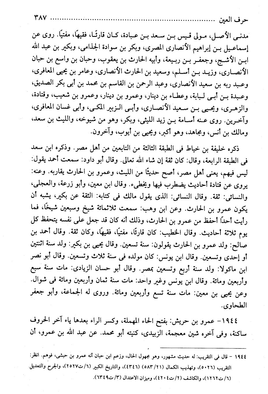 1944 - عمرو بن حريش: بفتح الحاء المهملة، وكسر الراء بعدها ياء آخر الحروف ساكنة، وفى آخره شين معجمة، الزبيدى، كنيته أبو محمد. عن عبد الله بن عمرو، أن