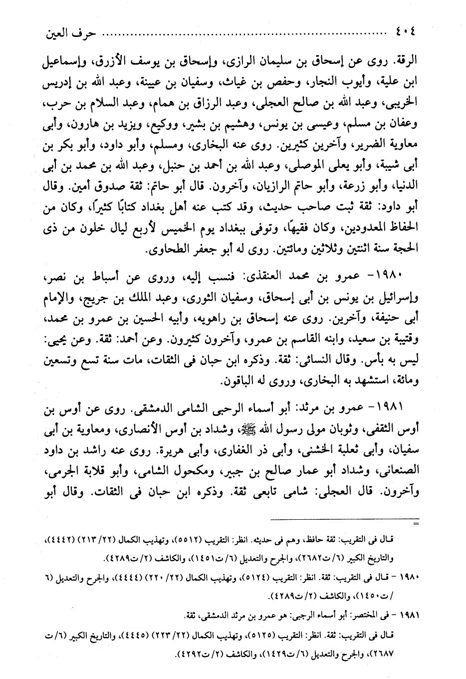 1980 - عمرو بن محمد العنقذى: فنسب إليه، وروى عن أسباط بن نصر، وإسرائيل بن يونس بن أبى إسحاق، وسفيان الثورى، وعبد الملك بن جريج، والإمام أبى حنيفة، وآخرين. روى عنه إسحاق بن راهويه، وأبيه الحسين بن عمرو بن محمد، وقتيبة بن سعيد، وابنه القاسم بن عمرو، وآخرون كثيرون. وعن أحمد: ثقة. وعن يحيى: ليس به بأس. وقال النسائى: ثقة. وذكره ابن حبان فى الثقات، مات سنة تسع وتسعين ومائة، استشهد به البخارى، وروى له الباقون.