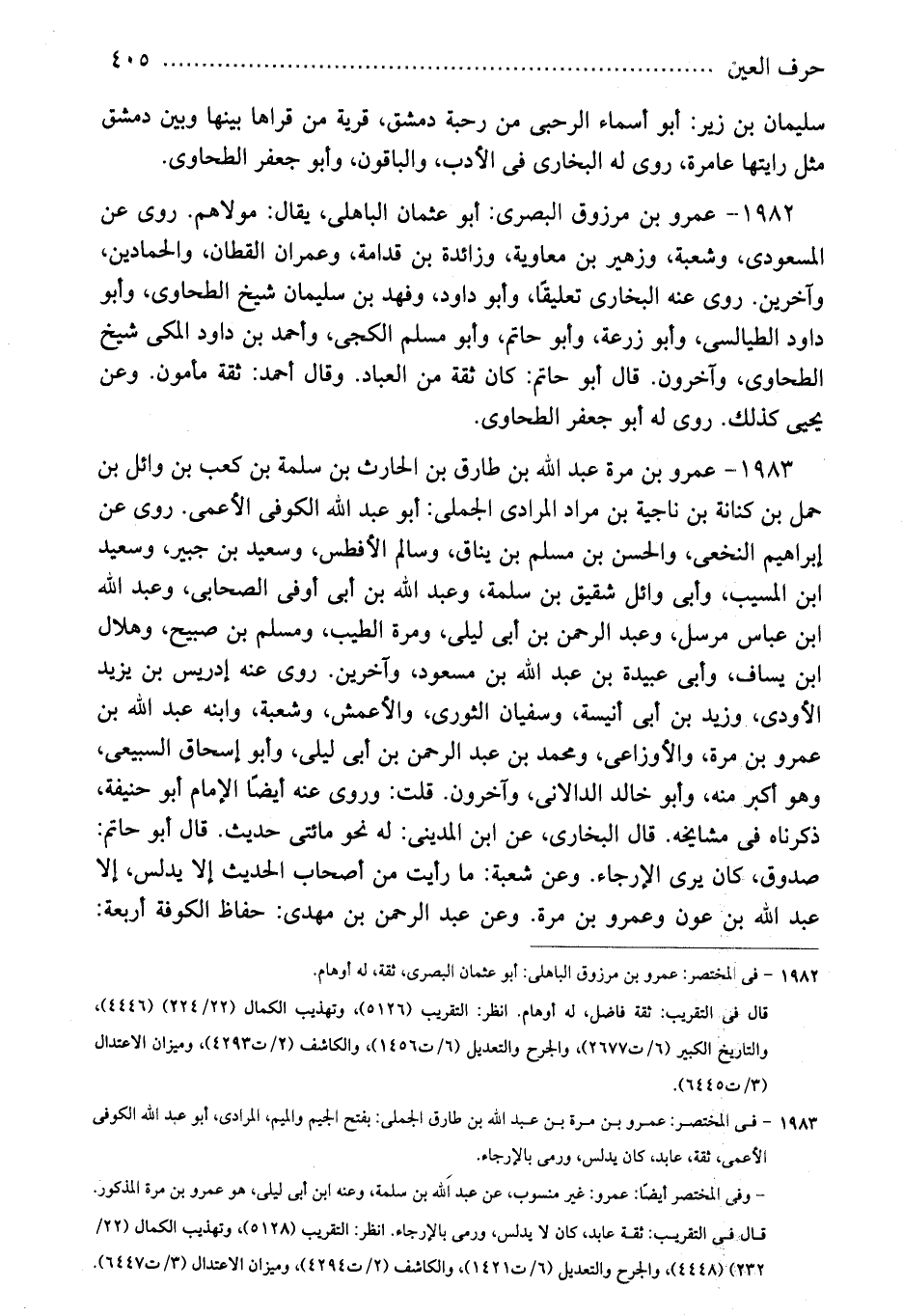 1983 - فى المختصر: عمرو بن مرة بن عبد الله بن طارق الجملى: بفتح الجيم والميم، المرادى، أبو عبد الله الكوفى الأعمى، ثقة، عابد، كان يدلس، ورمى بالإرجاء.