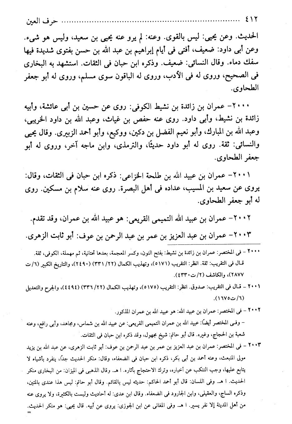 2000 - عمران بن زائدة بن نشيط الكوفى: روى عن حسين بن أبى عائشة، وأبيه زائدة بن نشيط، وأبى داود. روى عنه حفص بن غياث، وعبد الله بن داود الخريبى، وعبد الله بن المبارك، وأبو نعيم الفضل بن دكين، ووكيع، وأبو أحمد الزبيرى. وقال يحيى والنسائى: ثقة. روى له أبو داود حديثًا، والترمذى، وابن ماجه آخر، وروى له أبو جعفر الطحاوى.