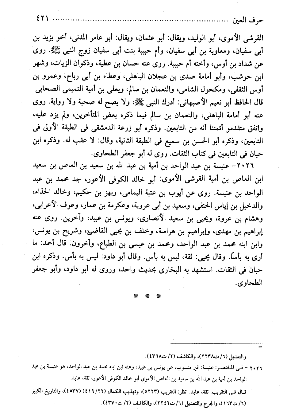 2026 - فى المختصر: عنبسة: غير منسوب، عن يونس بن عبيد، وعنه ابن ابنه محمد بن عبد الواحد، هو عنبسة بن عبد الواحد بن بن أمية بن عبد الله بن سعيد بن العاص الأموى أبو خالد الكوفى الأعور، ثقة، عابد.