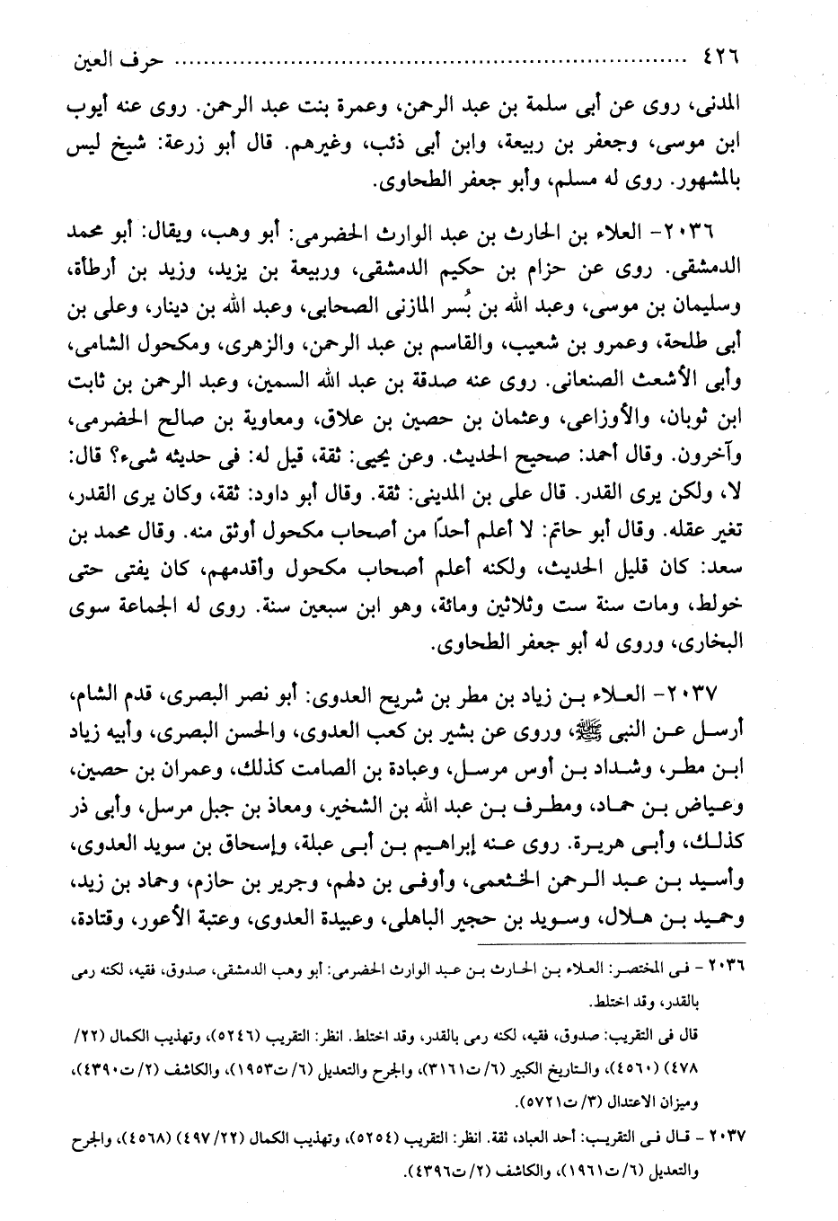 2036 - فى المختصر: العلاء بن الحارث بن عبد الوارث الحضرمى: أبو وهب الدمشقى، صدوق، فقيه، لكنه رمى بالقدر، وقد اختلط.