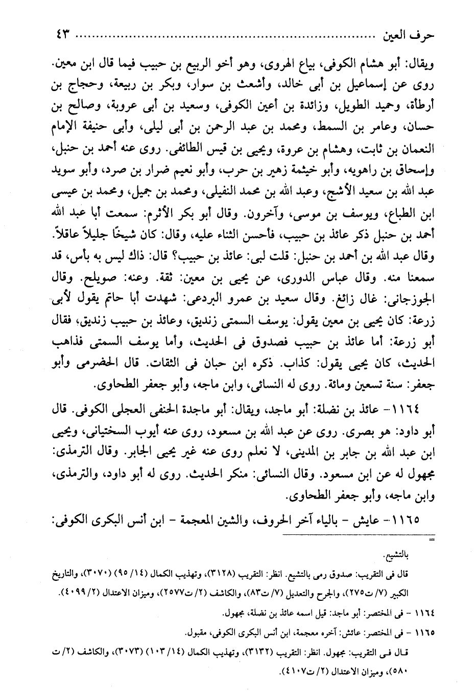 1164 - عائذ بن نضلة: أبو ماجد، ويقال: أبو ماجدة الحنفى العجلى الكوفى. قال أبو داود: هو بصرى. روى عن عبد الله بن مسعود، روى عنه أيوب السختيانى، ويحيى ابن عبد الله بن جابر بن المدينى، لا نعلم روى عنه غير يحيى الجابر. وقال الترمذى: مجهول له عن ابن مسعود. وقال النسائى: منكر الحديث. روى له أبو داود، والترمذى، وابن ماجه، وأبو جعفر الطحاوى.