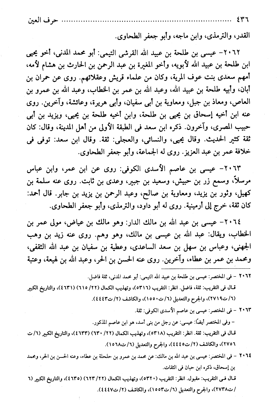 2062 - عيسى بن طلحة بن عبيد الله القرشى التيمى: أبو محمد المدنى، أخو يحيى ابن طلحة بن عبيد الله لأبويه، وأخو المغيرة بن عبد الرحمن بن الحارث بن هشام لأمه، أمهم سعدى بنت عوف المرية، وكان من علماء قريش وعقلائهم. روى عن حمران بن أبان، وأبيه طلحة بن عبيد الله، وعبد الله بن عمر بن الخطاب، وعبد الله بن عمرو بن العاص، ومعاذ بن جبل، ومعاوية بن أبى سفيان، وأبى هريرة، وعائشة، وآخرين. روى عنه ابن أخيه إسحاق بن يحيى بن طلحة، وابن أخيه طلحة بن يحيى، ويزيد بن أبى حبيب المصرى، وآخرون. ذكره ابن سعد فى الطبقة الأولى من أهل المدينة، وقال: كان ثقة كثير الحديث. وقال يحيى، والنسائى، والعجلى: ثقة. وقال ابن سعد: توفى فى خلافة عمر بن عبد العزيز. روى له الجماعة، وأبو جعفر الطحاوى.