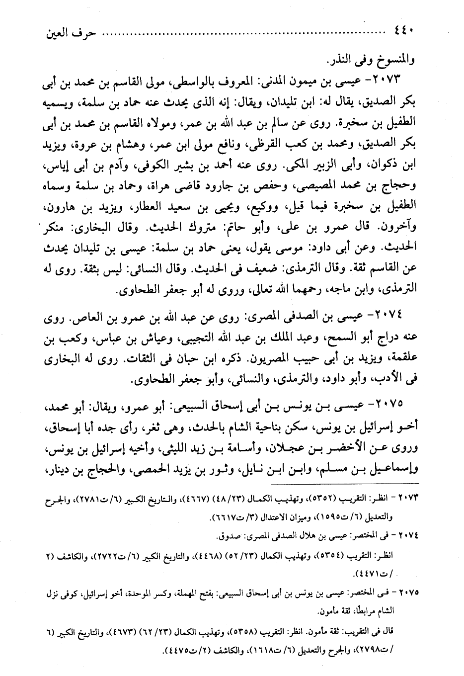 2075 - عيسى بن يونس بن أبى إسحاق السبيعى: أبو عمرو، ويقال: أبو محمد، أخو إسرائيل بن يونس، سكن بناحية الشام بالحدث، وهى ثغر، رأى جده أبا إسحاق، وروى عن الأخضر بن عجلان، وأسامة بن زيد الليثى، وأخيه إسرائيل بن يونس، وإسماعيل بن مسلم، وابن ابن نايل، وثور بن يزيد الحمصى، والحجاج بن دينار،