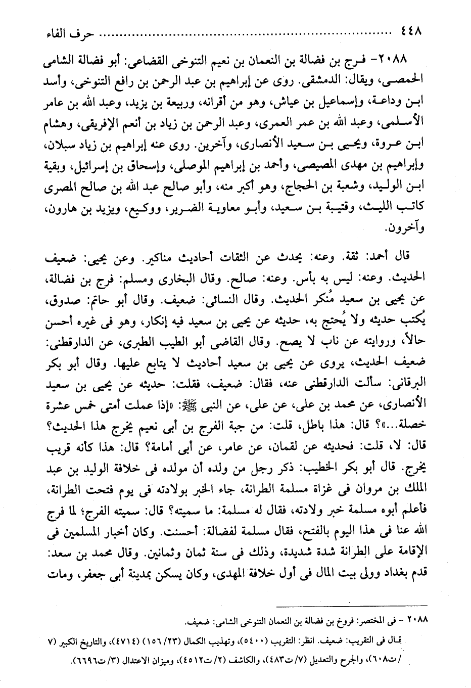 2088 - فى المختصر: فروخ بن فضالة بن النعمان التنوخى الشامى: ضعيف.