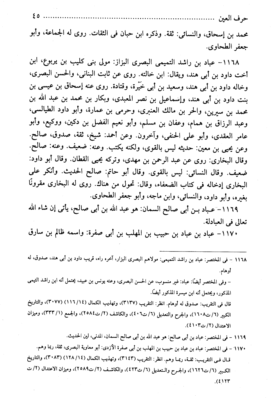 1168 - عباد بن راشد التميمى البصرى البزاز: مولى بنى كليب بن يربوع، ابن أخت داود بن أبى هند، ويقال: ابن خالته. روى عن ثابت البنانى، والحسن البصرى، وخاله داود بن أبى هند، وسعيد بن أبى خَيْرة، وقتادة. روى عنه إسحاق بن عيسى بن بنت داود بن أبى هند، وإسماعيل بن نصر المعبدى، وبكار بن محمد بن عبد الله بن محمد بن سيرين، والحر بن مالك العنبرى، وحرمى بن عمارة، وأبو داود الطيالسى، وعبد الرزاق بن همام، وعفان بن مسلم، وأبو نعيم الفضل بن دكين، ووكيع، وأبو عامر العقدى، وأبو على الحنفى، وآخرون. وعن أحمد: شيخ، ثقة، صدوق، صالح. وعن يحيى بن معين: حديثه ليس بالقوى، ولكنه يكتب. وعنه: ضعيف. وعنه: صالح. وقال البخارى: روى عن عبد الرحمن بن مهدى، وتركه يحيى القطان. وقال أبو داود: ضعيف. وقال النسائى: ليس بالقوى. وقال أبو حاتم: صالح الحديث. وأنكر على البخارى إدخاله فى كتاب الضعفاء، وقال: تحول من هناك. روى له البخارى مقرونًا بغيره، وأبو داود، والنسائى، وابن ماجه، وأبو جعفر الطحاوى.