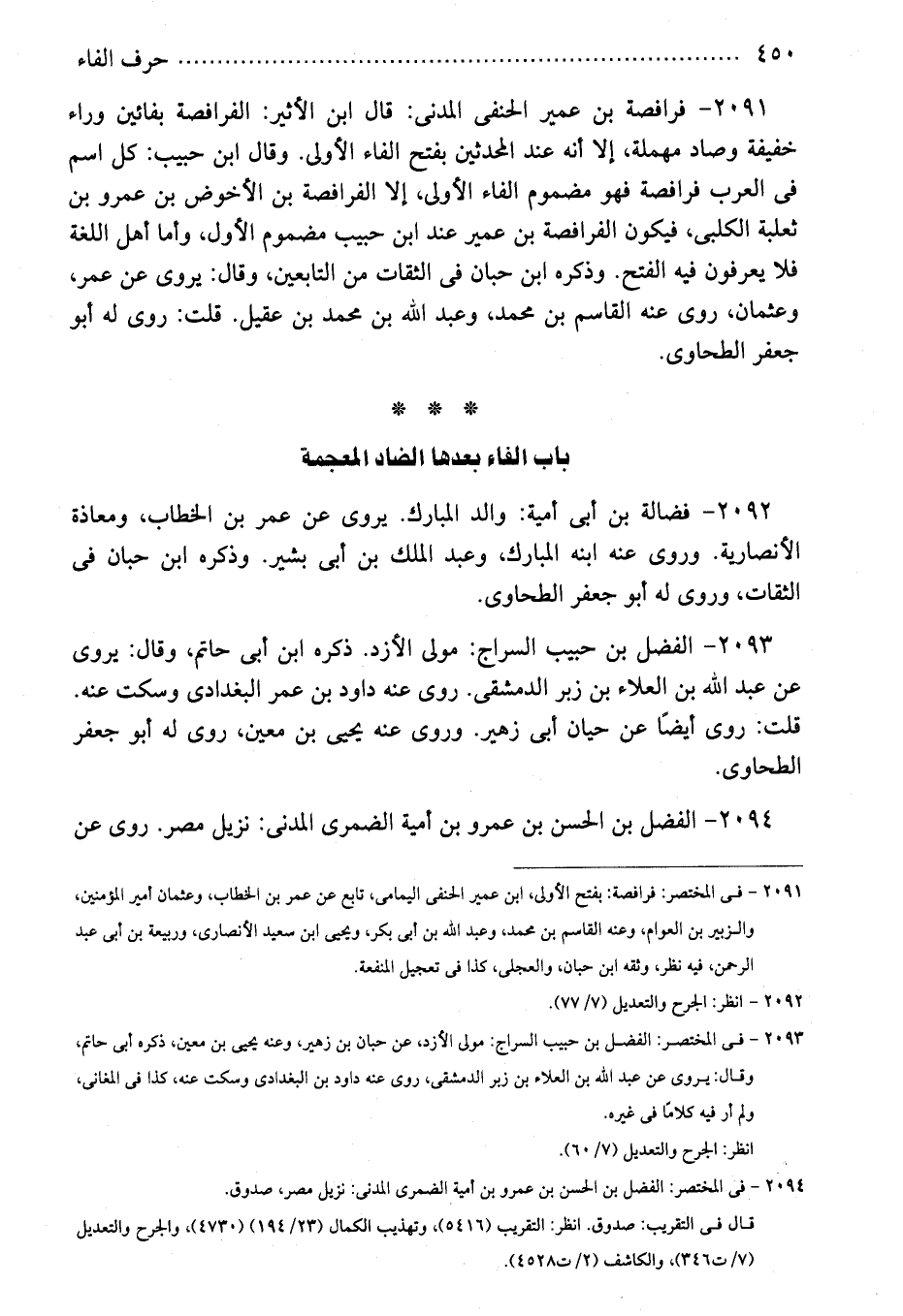 2091 - فرافصة بن عمير الحنفى المدنى: قال ابن الأثير: الفرافصة بفائين وراء خفيفة وصاد مهملة، إلا أنه عند المحدثين بفتح الفاء الأولى. وقال ابن حبيب: كل اسم فى العرب فرافصة فهو مضموم الفاء الأولى، إلا الفرافصة بن الأخوض بن عمرو بن ثعلبة الكلبى، فيكون الفرافصة بن عمير عند ابن حبيب مضموم الأول، وأما أهل اللغة فلا يعرفون فيه الفتح. وذكره ابن حبان فى الثقات من التابعين، وقال: يروى عن عمر، وعثمان، روى عنه القاسم بن محمد، وعبد الله بن محمد بن عقيل. قلت: روى له أبو جعفر الطحاوى.