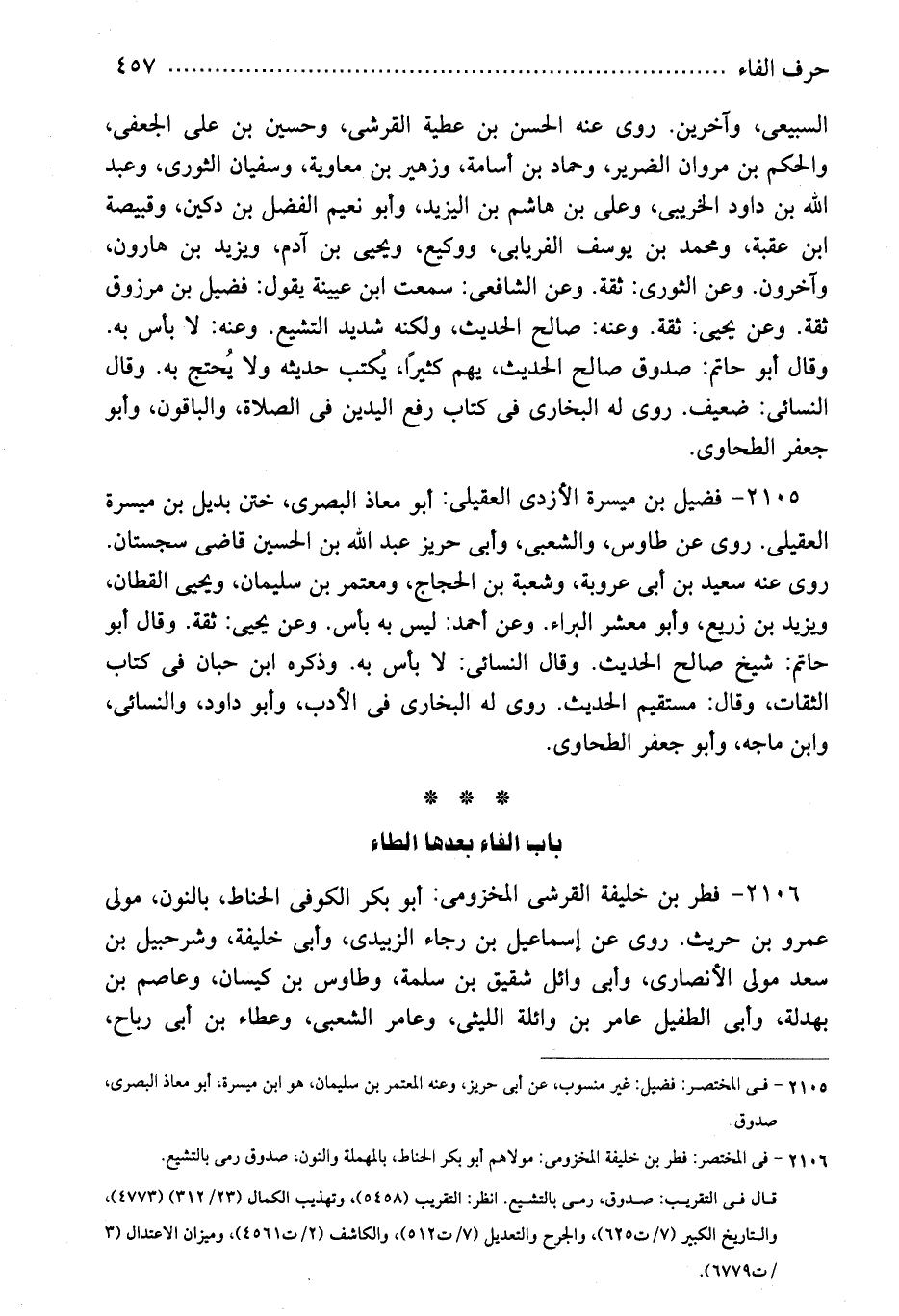 2106 - فى المختصر: فطر بن خليفة المخزومى: مولاهم أبو بكر الحناط، بالمهملة والنون، صدوق رمى بالتشيع.