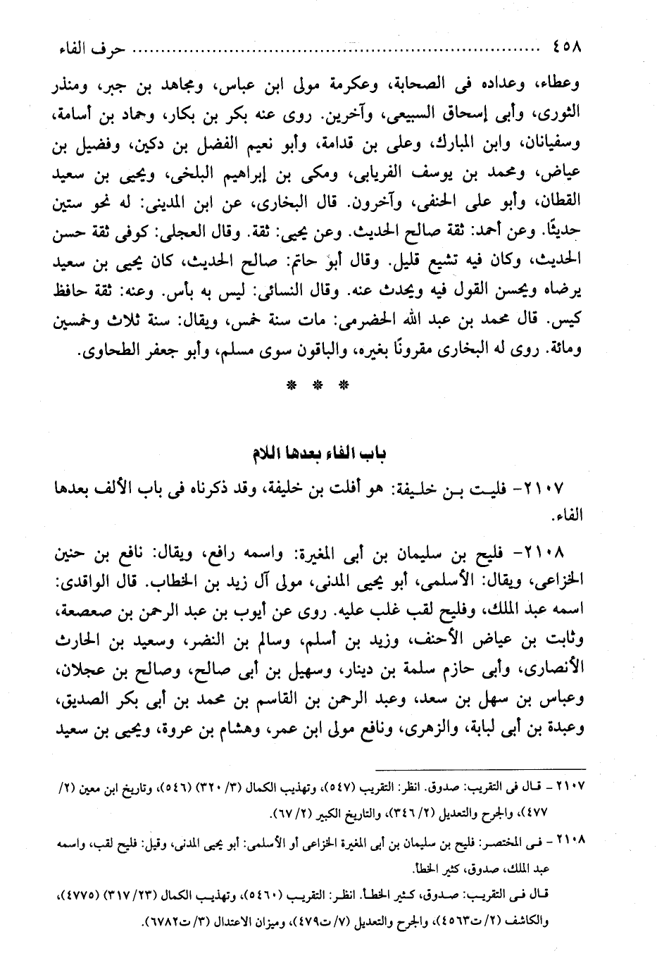 2108 - فى المختصر: فليح بن سليمان بن أبى المغيرة الخزاعى أو الأسلمى: أبو يحيى المدنى، وقيل: فليح لقب، واسمه عبد الملك، صدوق، كثير الخطأ. =