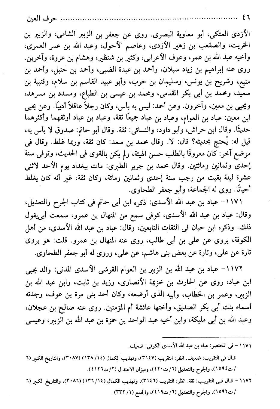 1171 - عباد بن عبد الله الأسدى: ذكره ابن أبى حاتم فى كتاب الجرح والتعديل، وقال: عباد بن عبد الله الأسدى، كوفى سمع من المنهال بن عمرو، سمعت أبىيقول ذلك. وذكره ابن حبان فى الثقات التابعين، وقال: عباد بن عبد الله الأسدى، من أهل الكوفة، يروى عن على بن أبى طالب، روى عنه المنهال بن عمرو. قلت: هو يروى تارة عن على، وتارة عن بعض بنى هاشم، عن على، وروى له أبو جعفر الطحاوى.