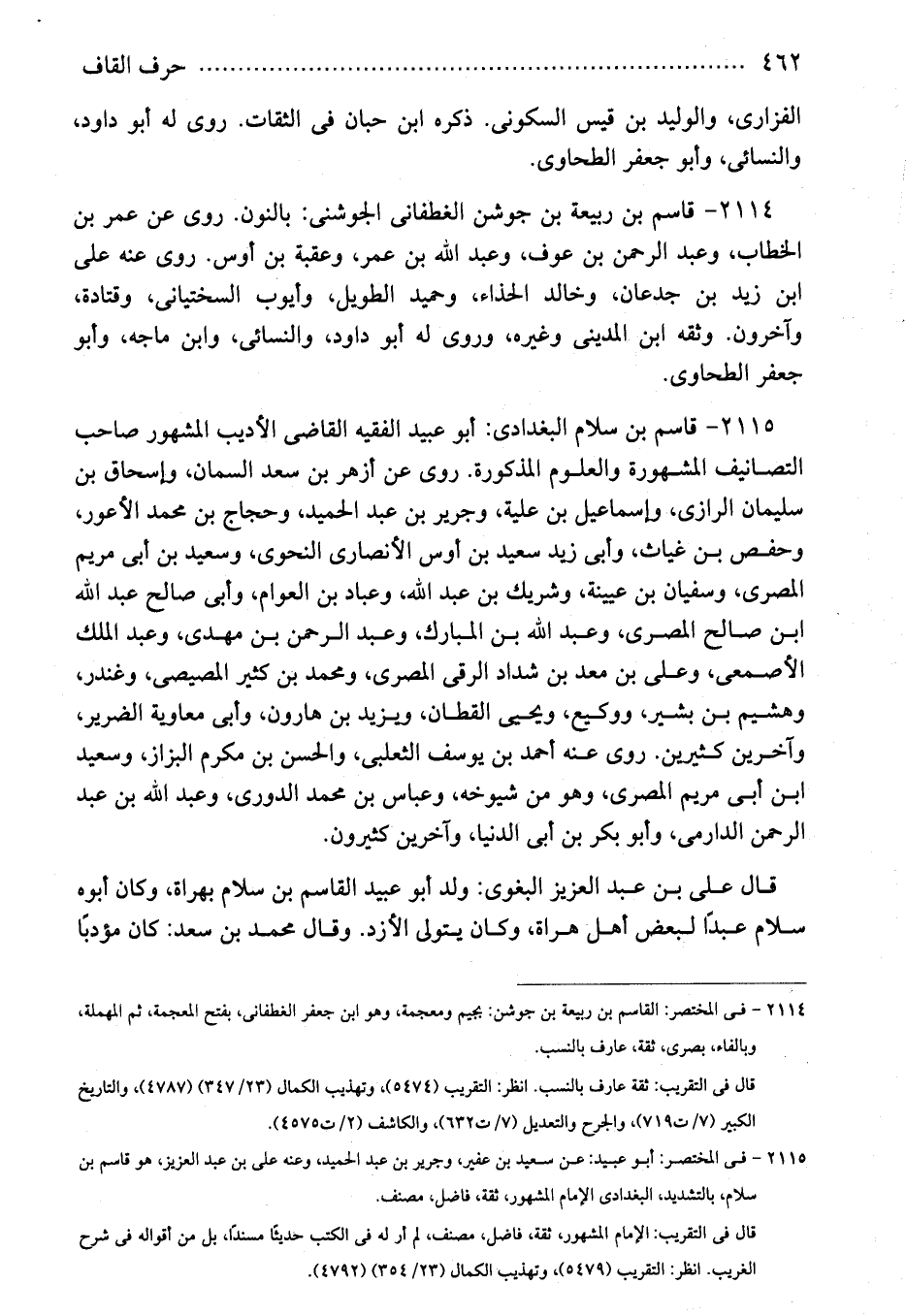 2115 - قاسم بن سلام البغدادى: أبو عبيد الفقيه القاضى الأديب المشهور صاحب التصانيف المشهورة والعلوم المذكورة. روى عن أزهر بن سعد السمان، وإسحاق بن سليمان الرازى، وإسماعيل بن علية، وجرير بن عبد الحميد، وحجاج بن محمد الأعور، وحفص بن غياث، وأبى زيد سعيد بن أوس الأنصارى النحوى، وسعيد بن أبى مريم المصرى، وسفيان بن عيينة، وشريك بن عبد الله، وعباد بن العوام، وأبى صالح عبد الله ابن صالح المصرى، وعبد الله بن المبارك، وعبد الرحمن بن مهدى، وعبد الملك الأصمعى، وعلى بن معد بن شداد الرقى المصرى، ومحمد بن كثير المصيصى، وغندر، وهشيم بن بشير، ووكيع، ويحيى القطان، ويزيد بن هارون، وأبى معاوية الضرير، وآخرين كثيرين. روى عنه أحمد بن يوسف الثعلبى، والحسن بن مكرم البزاز، وسعيد ابن أبى مريم المصرى، وهو من شيوخه، وعباس بن محمد الدورى، وعبد الله بن عبد الرحمن الدارمى، وأبو بكر بن أبى الدنيا، وآخرين كثيرون.