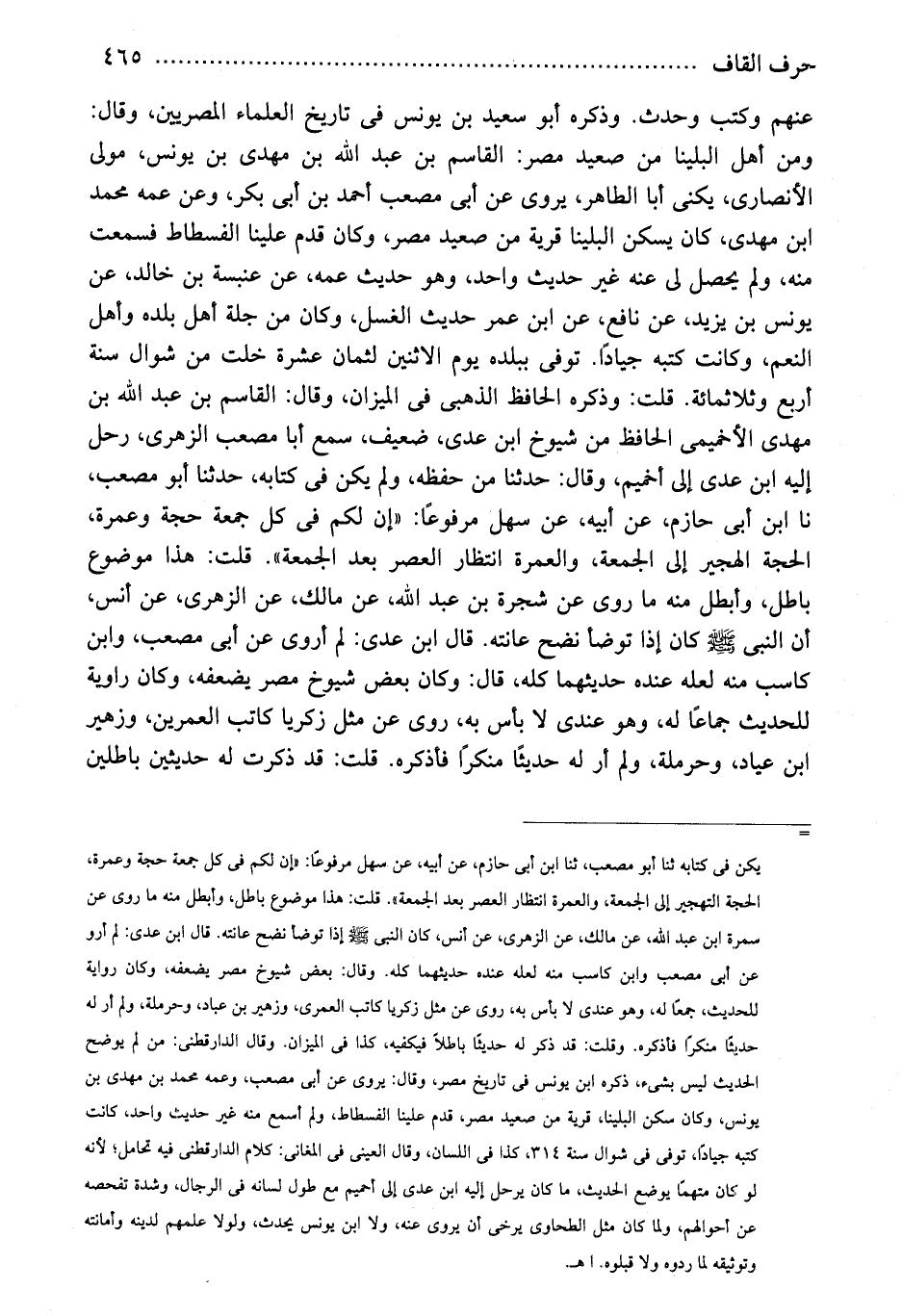 عنهم وكتب وحدث. وذكره أبو سعيد بن يونس فى تاريخ العلماء المصريين، وقال: ومن أهل البلينا من صعيد مصر: القاسم بن عبد الله بن مهدى بن يونس، مولى الأنصارى، يكنى أبا الطاهر، يروى عن أبى مصعب أحمد بن أبى بكر، وعن عمه محمد ابن مهدى، كان يسكن البلينا قرية من صعيد مصر، وكان قدم علينا الفسطاط فسمعت منه، ولم يحصل لى عنه غير حديث واحد، وهو حديث عمه، عن عنبسة بن خالد، عن يونس بن يزيد، عن نافع، عن ابن عمر حديث الغسل، وكان من جلة أهل بلده وأهل النعم، وكانت كتبه جيادًا. توفى ببلده يوم الاثنين لثمان عشرة خلت من شوال سنة أربع وثلاثمائة. قلت: وذكره الحافظ الذهبى فى الميزان، وقال: القاسم بن عبد الله بن مهدى الأخميمى الحافظ من شيوخ ابن عدى، ضعيف، سمع أبا مصعب الزهرى، رحل إليه ابن عدى إلى أخميم، وقال: حدثنا من حفظه، ولم يكن فى كتابه، حدثنا أبو مصعب، نا ابن أبى حازم، عن أبيه، عن سهل مرفوعًا: "إن لكم فى كل جمعة حجة وعمرة، الحجة الهجير إلى الجمعة، والعمرة انتظار العصر بعد الجمعة". قلت: هذا موضوع باطل، وأبطل منه ما روى عن شجرة بن عبد الله، عن مالك، عن الزهرى، 'ن أنس، أن النبى - صلى الله عليه وسلم - كان إذا توضأ نضح عانته. قال ابن عدى: لم أروى عن أبى مصعب، وابن كاسب منه لعله عنده حديثهما كله، قال: وكان بعض شيوخ مصر يضعفه، وكان راوية للحديث جماعًا له، وهو عندى لا بأس به، روى عن مثل زكريا كاتب العمرين، وزهير ابن عياد، وحرملة، ولم أر له حديثًا منكرًا فأذكره. قلت: قد ذكرت له حديثين باطلين