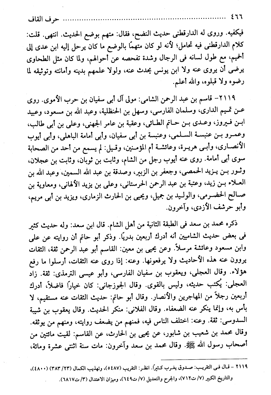 2119 - قاسم بن عبد الرحمن الشامى: مولى آل أبى سفيان بن حرب الأموى. روى عن تميم الدارى، وسلمان الفارسى، وسهل بن الحنظلية، وعبد الله بن مسعود، وعبيد ابن فيروز، وعدى بن حاتم الطائى، وعقبة بن عامر الجهنى، وعلى بن أبى طالب، وعمرو بن عنبسة السلمى، وعنبسة بن أبى سفيان، وأبى أمامة الباهلى، وأبى أيوب الأنصارى، وأبى هريرة، وعائشة أم المؤمنين، وقيل: لم يسمع من أحد من الصحابة سوى أبى أمامة. روى عنه أيوب رجل من الشام، وثابت بن ثوبان، وثابت بن عجلان، وثور بن يزيد الحمصى، وجعفر بن الزبير، وصدقة بن عبد الله السمين، وعبد الله بن العلاء بن زيد، وعتبة بن عبد الرحمن الحرستانى، وعلى بن يزيد الألهانى، ومعاوية بن صالح الحضرمى، والوليد بن جميل، ويحيى بن الحارث الزمارى، ويزيد بن أبى مريم، وأبو حرشف الأزدى، وآخرون.