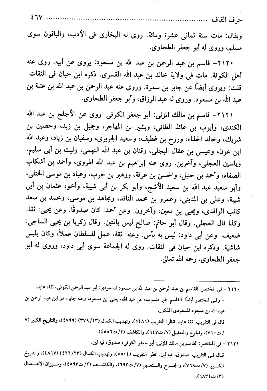 2120 - فى المختصر: القاسم بن عبد الرحمن بن عبد الله بن مسعود المسعودى: أبو عبد الرحمن الكوفى، ثقة، عابد.