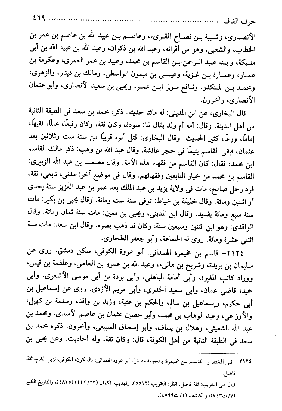 2124 - فى المختصر: القاسم بن مخيمرة: بالمعجمة مصغرًا، أبو عروة الهمدانى، بالسكون، الكوفى، نزيل الشام، ثقة، فاضل.