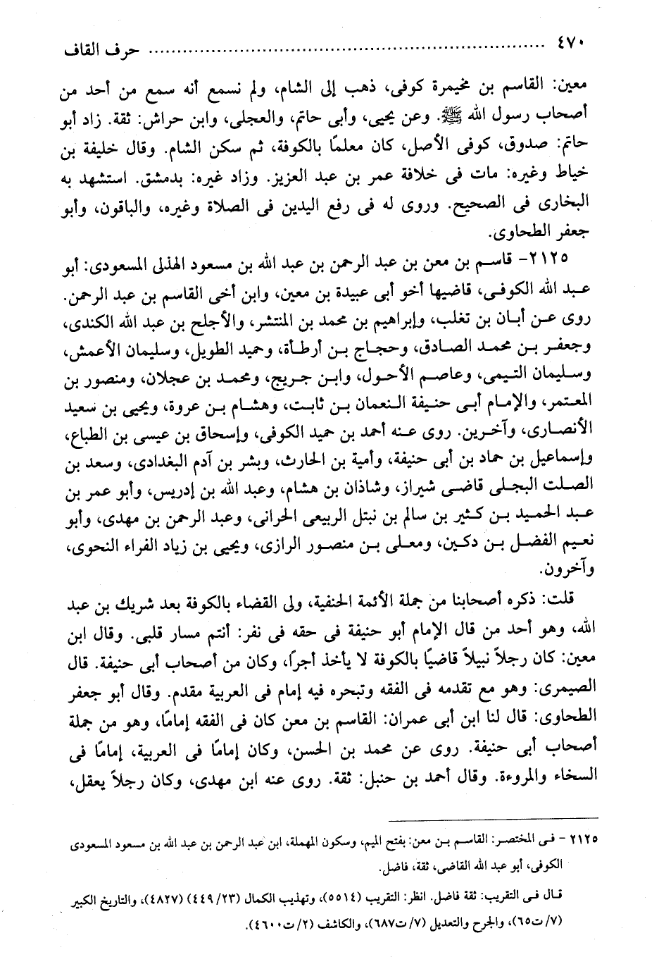 2125 - قاسم بن معن بن عبد الرحمن بن عبد الله بن مسعود الهذلى المسعودى: أبو عبد الله الكوفى، قاضيها أخو أبى عبيدة بن معين، وابن أخى القاسم بن عبد الرحمن. روى عن أبان بن تغلب، وإبراهيم بن محمد بن المنتشر، والأجلح بن عبد الله الكندى، وجعفر بن محمد الصادق، وحجاج بن أرطأة، وحميد الطويل، وسليمان الأعمش، وسليمان التيمى، وعاصم الأحول، وابن جريج، ومحمد بن عجلان، ومنصور بن المعتمر، والإمام أبى حنيفة النعمان بن ثابت، وهشام بن عروة، ويحيى بن سعيد الأنصارى، وآخرين. روى عنه أحمد بن حميد الكوفى، وإسحاق بن عيسى بن الطباع، وإسماعيل بن حماد بن أبى حنيفة، وأمية بن الحارث، وبشر بن آدم البغدادى، وسعد بن الصلت البجلى قاضى شيراز، وشاذان بن هشام، وعبد الله بن إدريس، وأبو عمر بن عبد الحميد بن كثير بن سالم بن نبتل الربيعى الحرانى، وعبد الرحمن بن مهدى، وأبو نعيم الفضل بن دكين، ومعلى بن منصور الرازى، ويحيى بن زياد الفراء النحوى، وآخرون.